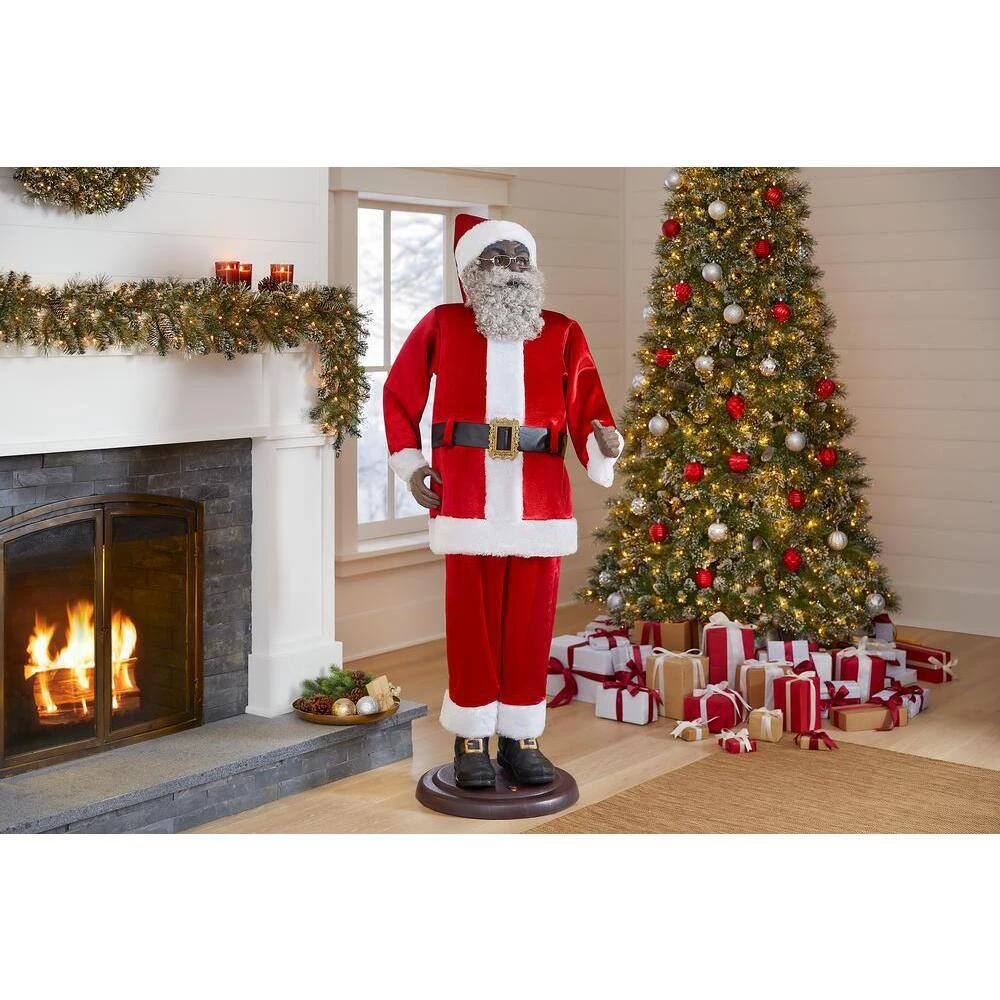 Bring the 72 in. Animated Ethnic Santa into your holiday decor for plenty of extra cheer. This jolly Santa sings and dances to fill your home with Christmas spirit. His velveteen Santa suit and hat, soft, curly beard and glasses give him a realistic and friendly look. Place him in your entryway or on your porch or try him at your school, restaurant or business to inspire holiday smiles.