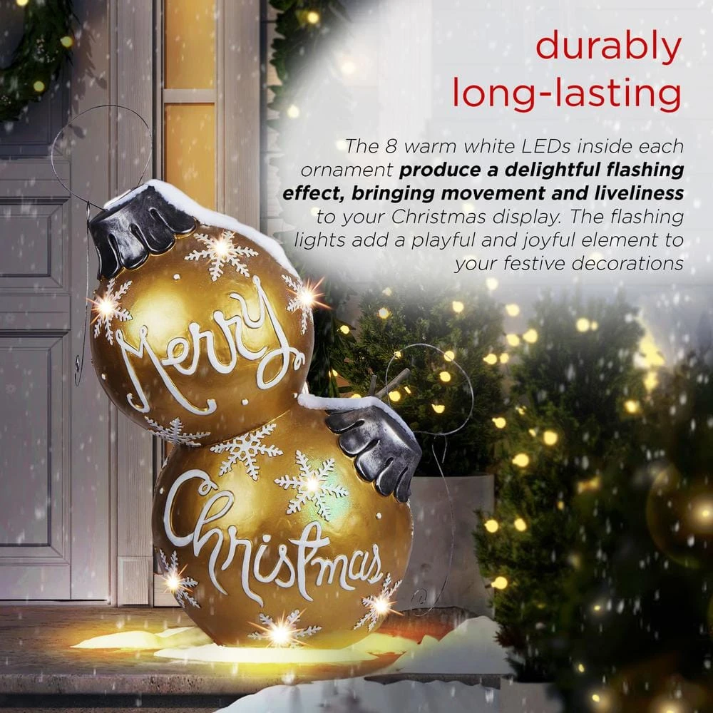 The ZTY138XL Gold Merry Christmas Ornaments with 8 Warm White LEDs XL is a festive creation by Alpine Corporation. Standing 48 in. tall, this ornament features a gold Christmas ball adorned with crisp white