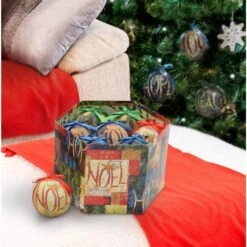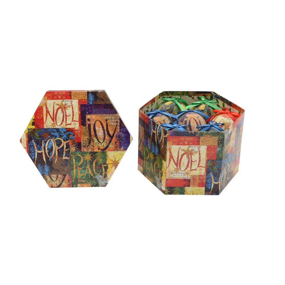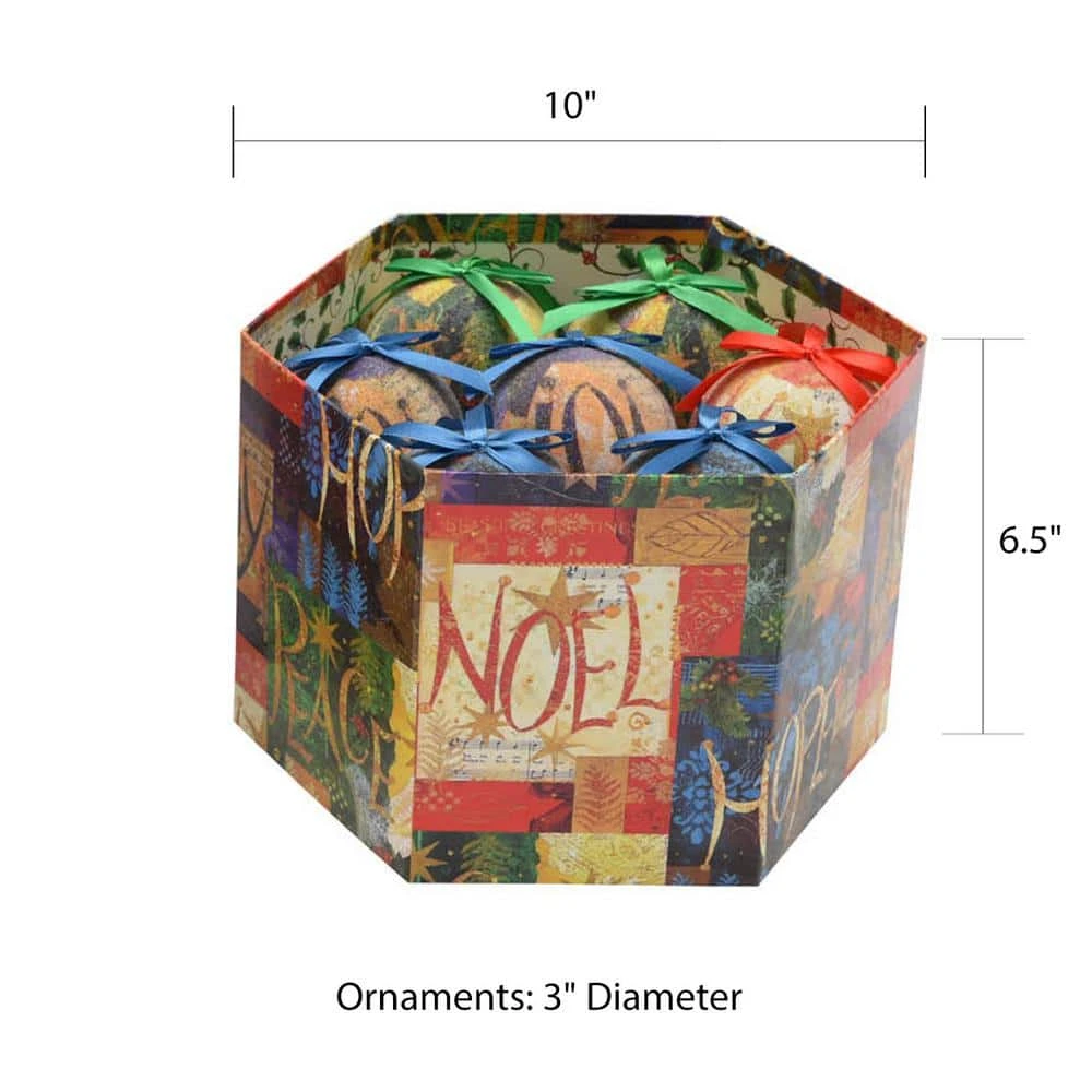 Spread the uplifting message of the holiday season with inspirational words of wisdom. Beaded glass, lightly frosted ornaments feature illustrated collage art with the words hope, joy, peace and noel. Complete with blue, green and red ribbon ties. Each set of 14 includes 4