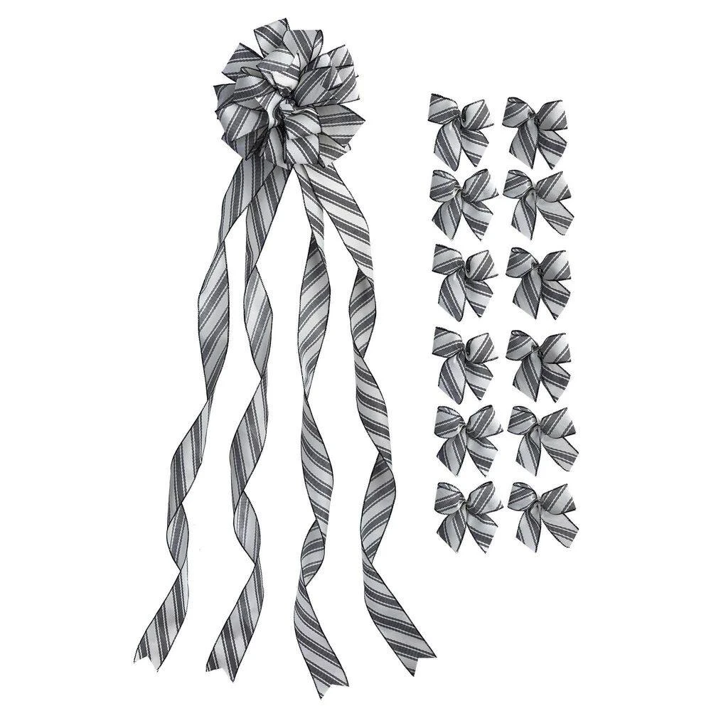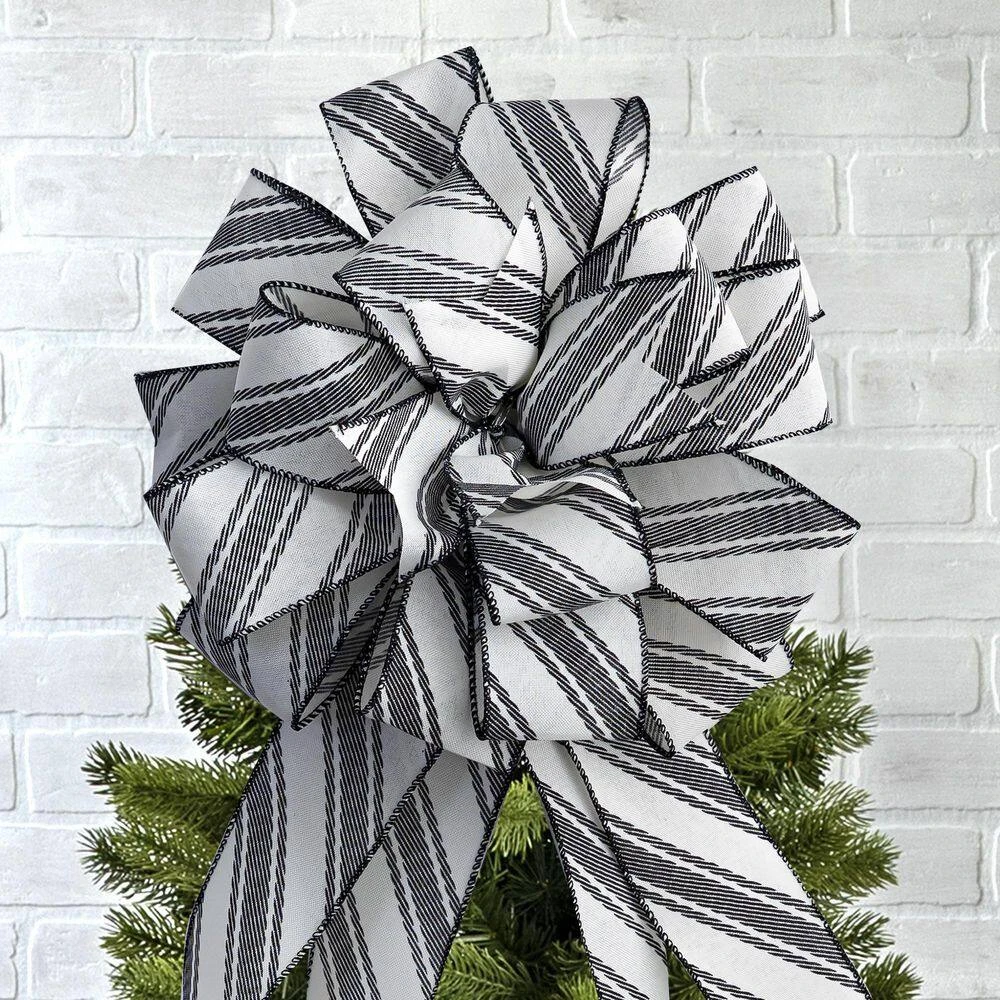 A more casual take on traditional ribbon tree toppers, the New Traditions Large Ivory Stripe Ribbon Christmas Tree Topper Bow and 12 Mini Bows are a festive addition to any holiday decor. The set is made from designer-quality fabric ribbon with wired edges, making both the loops and tails effortless to style and shape. A single extra-long bow fashioned from wide fabric ribbons can be used as a Christmas tree topper or arranged with a few Christmas ornaments as a focal point holiday decoration on a mantle, front door or porch railing. The lavish decorative bow measures 11 in. across and features 16 loops made from 2.5 in. W ribbon in a classic ticking stripe fabric of ivory and black. The tails are fashioned from the same wired ribbon and measure 53 in. L. The set also includes (12) smaller 2-loop decorative bows measuring 5 in. x 5 in., crafted from 2 in. ribbons in the same ticking stripe fabric. The built-in twist able wires make them easy to attach to Christmas trees, holiday wreaths, bannister’s, railings, mantles and anywhere else you might want to decorate with these festive holiday trimmings. Perfect for both indoor and outdoor decoration, these durable, high quality Christmas bows are reusable holiday decorations year after year.