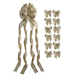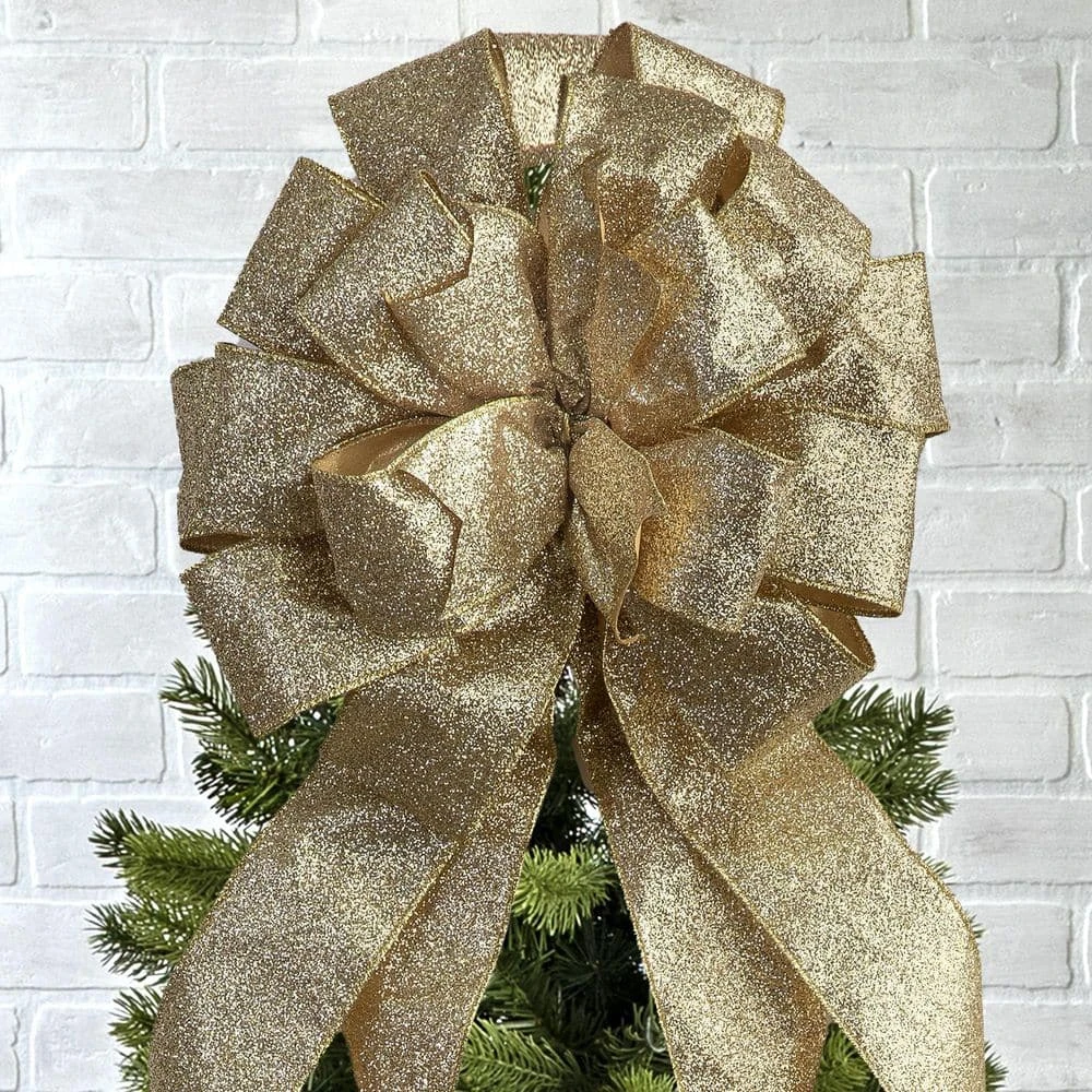 The New Traditions Large Gold Glitter Ribbon Christmas Tree Topper Bow and 12 Mini Bows are an elegant addition to any holiday decor. The set is made from designer-quality fabric ribbon with wired edges, making both the loops and tails effortless to style and shape. A single extra-long bow fashioned from wide fabric ribbons can be used as a Christmas tree topper or arranged with a few Christmas ornaments as a focal point holiday decoration on a mantle, front door, or porch railing. The lavish decorative bow measures 11 in. across and features sixteen loops made from 2.5 in. W ribbon in a festive gold fabric with a chunky glitter texture. The tails are fashioned from the same wired ribbon and measure 53 in. L. The set also includes (12) smaller 2-loop decorative bows measuring 5 in. by 5 in., crafted from 2 in. ribbons in the same gold and glitter fabric. The built-in twistable wires make them easy to attach to Christmas trees, holiday wreaths, bannisters, railings, mantles, and anywhere else you might want to decorate with these festive holiday trimmings. Perfect for both indoor and outdoor decoration, these durable, high quality Christmas bows are reusable holiday decorations year after year.