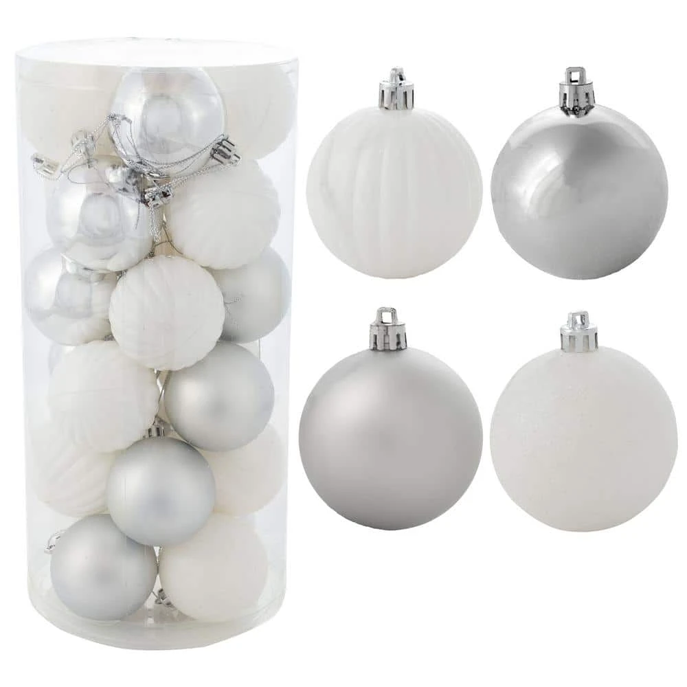 Add glitter and shine to the holiday season with this 24-piece shatterproof ornament set. Each ball includes a hanging loop to easily decorate! Remove the loops to use as fun and sparkly decorative filler for bowls and vases. This kit includes all the decorations needed to fill out the tree, hang from a garland, deck the halls, or use as decorative bowl filler to brighten any holiday experience. Additionally, the shatterproof design expertly combines the beauty and glitz of glass with the practicality of plastic, so they are a wonderful option for families with children or pets. Easily store and use these Christmas balls year after year without fear of them breaking easily. This set features 4 different styles: a textured striped bulb, a solid-colored bulb, one covered in glitter, and one mirror-styled bulb.