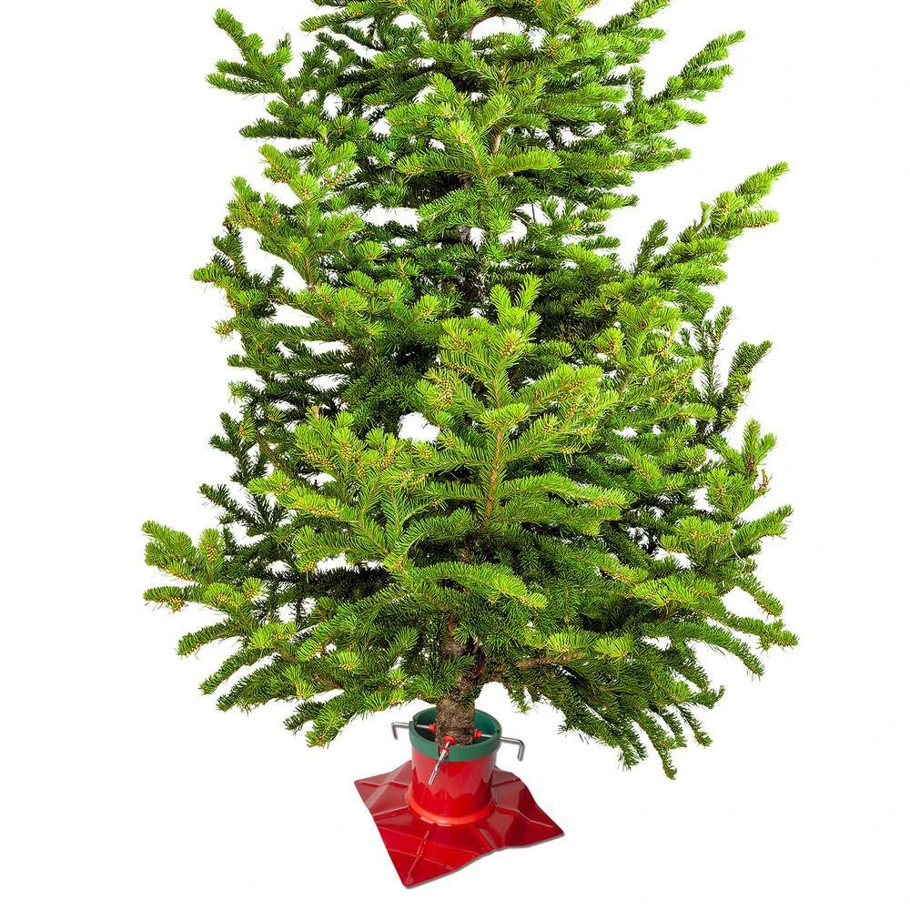 Heavy-duty and reliable christmas tree stands. Fits up to 5.5 in. trunk diameter. Impact-grade plastic water reservoir with 1 Gal. water capacity. heavy-duty support bolts with stabilizing end caps. Unique Turn Straight centering system locks trunk in place. Weight-absorbing base prevents tipping and features Anti-Scratch floor protection pads. Steel construction has powder coated baked enamel finish. Assembly required. 16 in. L x 16 in. W x 8.5 in. H (9 lbs.).