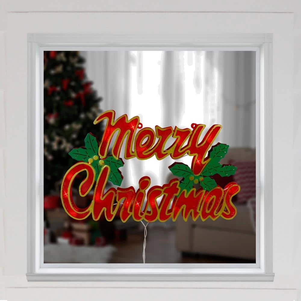 Light up your home this holiday season with this ‘Merry Christmas’ window silhouette. The perfect way to spruce up your decor with very little work. Add this decoration to your home for a bright touch of holiday spirit. Product Features: Color: clear bulbs / white wire. Number of bulbs: 20. Bulb size: mini. 24 in. white lead cord. 1-sided design. Durable and re-usable. Additional Product Features: Super bright bulbs. UL certified and approved for indoor use only. If 1-bulb burns out the rest will stay lit. Comes with replacement bulbs spare fuses and a suction cup for mounting the decoration. Contains 1 plug with end connector which allows you to stack multiple lighted items together (not to exceed 210-Watt). Wire gauge: 22. Dimensions: 10.25 in. H x 16.5 in. W x 0.75 in. D. Material(s): plastic/wire/glass bulbs.