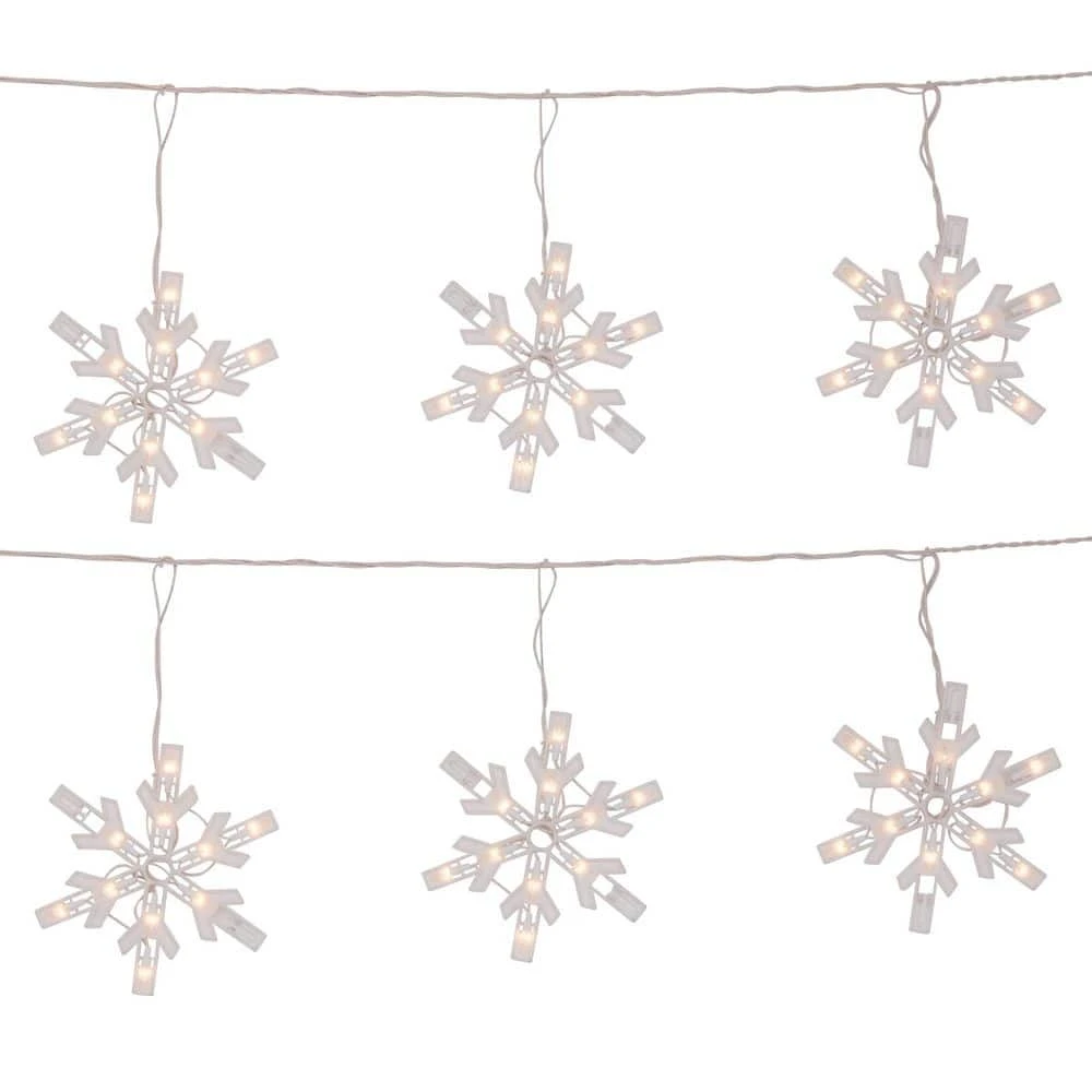 These snowflake lights will brighten your home this holiday in a unique style. The twinkling effect adds an extra flair to your displays. Perfect for home garden and restaurant decor. Product Features: Color: clear bulbs / white wire. Each snowflake has 10 lights. Number of bulbs on string: 100. Bulb size: mini. Spacing between each snowflakes: 12