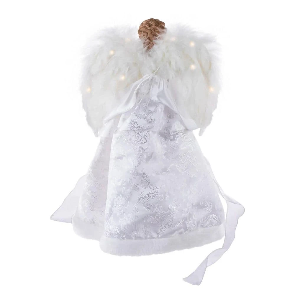 This exquisite angel features lighted wings that radiate a soft glow casting a warm and inviting ambiance throughout your festive space. Adorned in a white coat with a captivating floral motif she exudes grace and beauty. The red underlay delicately accented with white trim adds a vibrant pop of color making her a captivating centerpiece for your holiday decorations. Let this celestial angel take your Christmas tree to new heights and create a truly magical atmosphere this holiday season. Product Features: White and red angel tree topper. The angel wears a white coat with a beautiful floral motif and a red underlay accented with white trim. The dress is accented with white faux fur trim with red and white ribbons. White angel wings lit with warm white micro rice bulbs. Requires 3 in. LR44 in. batteries (batteries included). Convenient on/off summary on the battery pack located under the skirt. Includes a fabric pouch with a hook-and-loop fastener attached to the cone base used for storing the battery pack. Comes with a plastic cone to place over your tree top or tabletop. For indoor use only. Dimensions: 14 in. high x 5 in. diameter. Material(s): plastic/fabric.