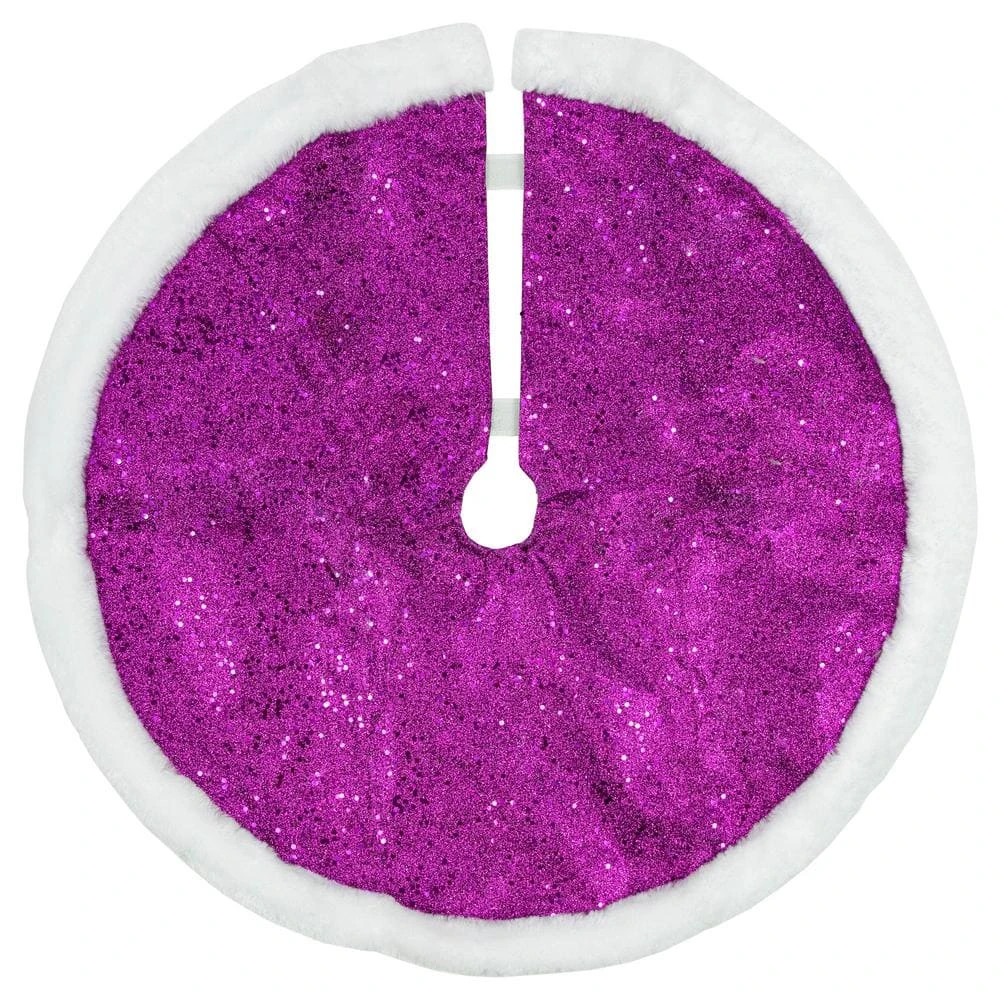 There can never be too much glitter when it comes to Christmas. Add some sparkle to your holiday decor with this glittered mini tree skirt. The tree skirt is purple embellished in glitter with a faux fur lining. Great for all kinds of holiday decorations including tree trimming mantle displays table tops centerpieces and more. Product Features: Purple Christmas tree skirt. Features holographic glittered base. Trimmed in white faux fur with a mesh lining. Contians 2 hook and loop fastener fasteners. The tree skirt is circle in shape. Recommended for indoor use only. Dimensions: 20 in. Dia. Material(s): polyester.