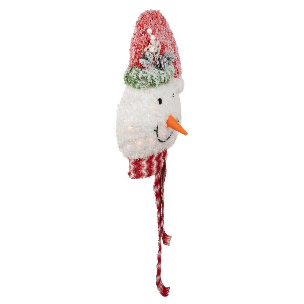 No Christmas is complete without a snowman and this unique find is a must have for the winter season. Decked out in a red frosted hat and striped scarf this tree topper is winter ready. Warm white lights offer the perfect amount of holiday glow. Product Features: Lighted snowman tree topper. Pre-lit with 20 warm white lights. Bulb size: mini. Bulb type: incandescent. 50 in. white lead cord. If 1 bulb burns out the rest will stay lit. Comes with replacement bulbs and spare fuses. UL approved and certified for indoor use. Dimensions: 21 in. H x 14 in. W x 10 in. D. Material(s): polyester/wire/plastic/metal.