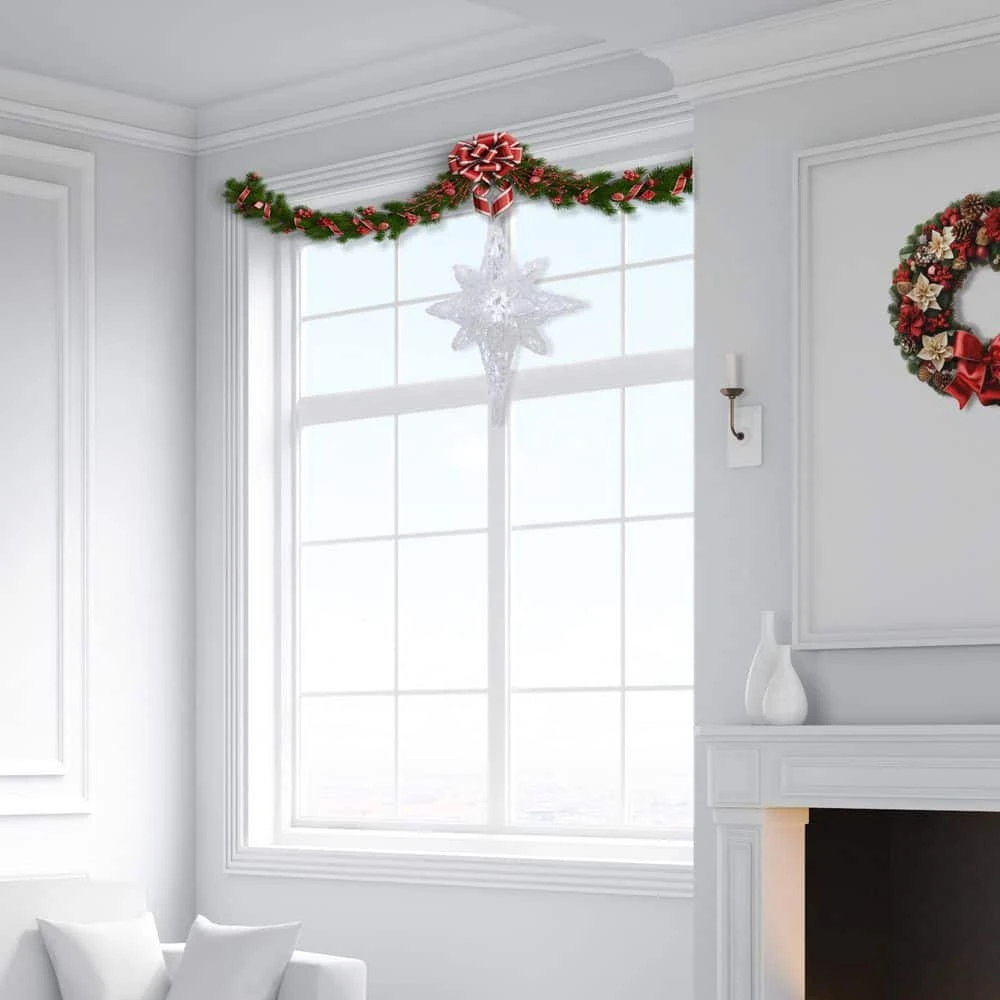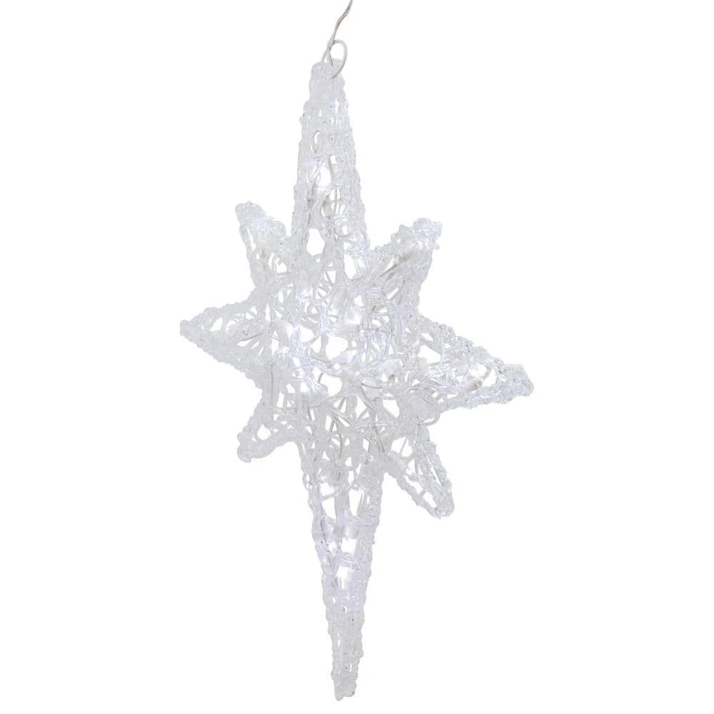 This large clear Bethlehem star will be the focal point of your holiday decor. A unique way to decorate your home or office for the holiday season with pure white twinkling lights. Add to your windows doors or use to complete a light show! Product Features: Number of bulbs inside star: 50. Bulb color: pure white. Bulb size: wide angle. 35 in. white lead cord. Bulbs twinkle at random. Recommended for indoor use. Additional product features of LED lights: Comes with replacement bulbs and spare fuses. Cool to the touch. Wire gauge: 22. Input: volts hertz .00 amps. Output: volts amps. Dimensions: 24 in. H x 18 in. W x 4.5 in. D. Material(s): acrylic/plastic/wire.
