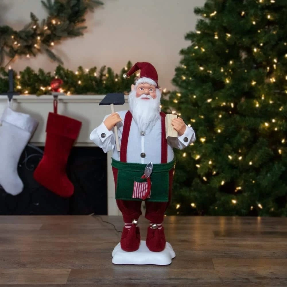 Santa’s helper elf is full of Christmas charm and would make a perfect addition to your holiday decor. He is wearing red overalls a white shirt and elf boots. Holding a hammer in his hand he is ready to design Christmas toys. He is a must-have for your holiday festivities. Features. Standing work elf Christmas figure. Wearing red overalls a white shirt red elf shoes with bells and a matching hat. Also wearing a green work apron with pliers. Wooden hammer in his right hand; block of wood in his left hand. Santa Claus animation allows his arms to open and close; his head also moves. Standing on a white base. Power adaptor included; 6 ft. cord. 4.5VDC adaptor; 120-Volt AC power outlet. Power switch on the back of the base. Recommended for indoor use only. Dimensions: 24 in. H x 8 in. W x 11 in. D (arms in open position). Material(s): plastic/fabric. Note: For decorative purpose only; this is not a toy.