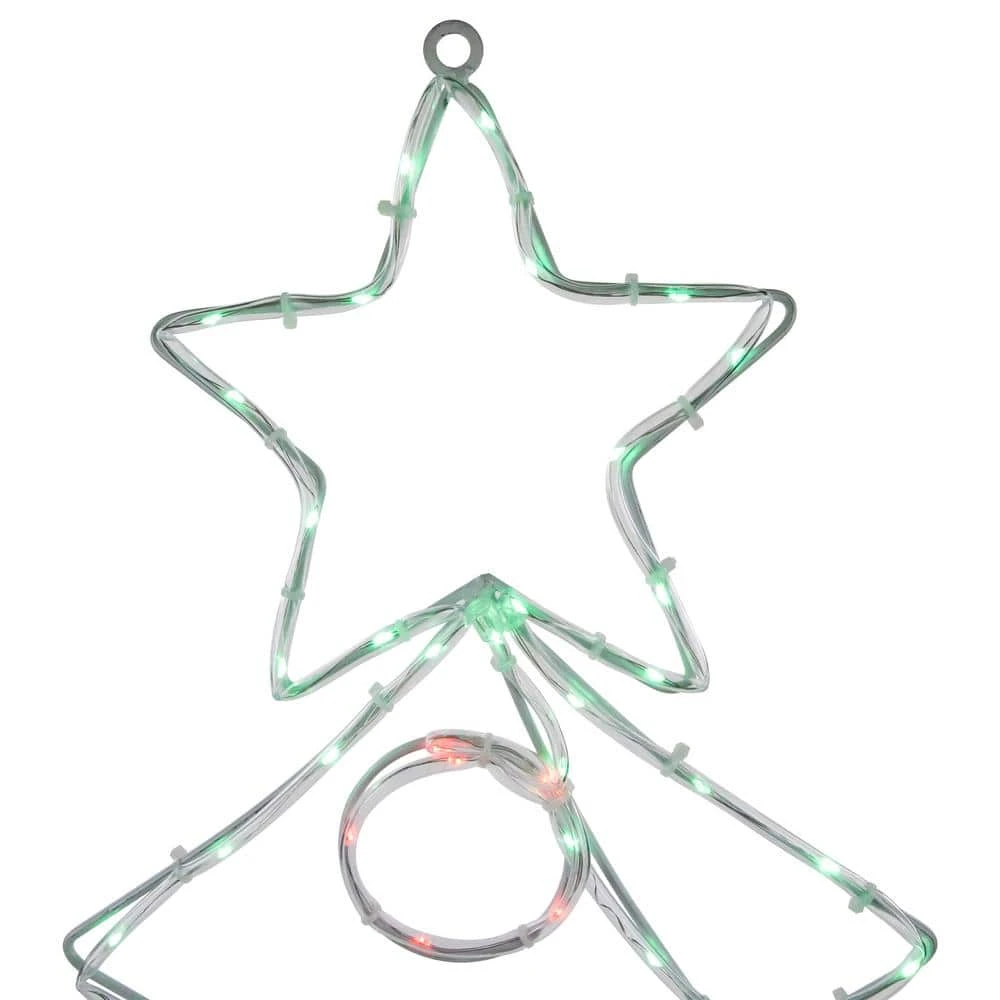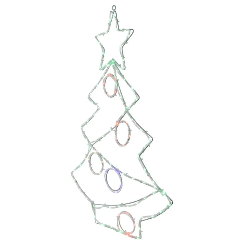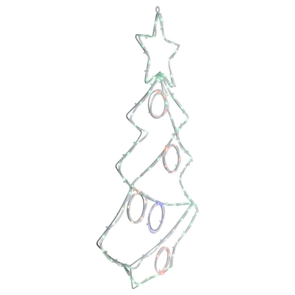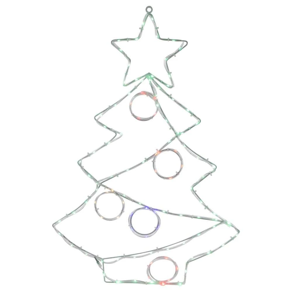 This festive decoration features a beautifully designed Christmas tree silhouette adorned with a variety of colorful ornaments that light up with bright LED lights. The perfect addition to any window or wall this decoration is easy to install and adds a touch of warmth and joy to any room. Whether you’re looking to create a cozy atmosphere for your family or add some holiday cheer to your workplace this LED lighted Christmas tree is sure to delight all who see it. Product Features: Tube color: clear. Bulb color: green red clear and blue. White frame. Number of bulbs: 110. Bulb size: micro fairy. Bulb type: LED. 48 in. white lead cord. 1-sided design. Additional Product Features: Super bright bulbs. UL certified and approved for indoor or outdoor use. If one bulb burns out the rest will stay lit. Contains 1 AC adaptor plug. Durable non-replaceable plastic bulbs. Cool to the touch. Wire Gauge: 24. Input: 120-Volt 60hz .11 Amp. Output: 3.5-Volt 0.9 Amp. Dimensions: 28 in. H x 19.5 in. W x 5 in. D. Material(s): plastic/wire/metal.