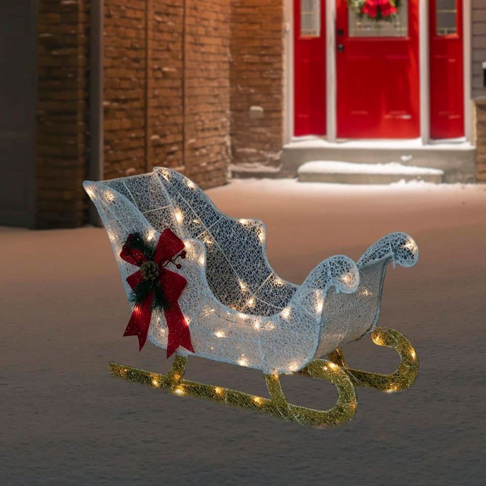 This well done sleigh decoration adds the perfect amount of light and sparkle. LED warm white lights provide a soft but bright glow that reflects off the glittery fabric. Made for outdoor use this durable display will add joy to your yard season after season. Product Features: Lighted outdoor Christmas sleigh decoration. Pre-lit with 60 clear lights. Bulb size: mini. Bulb type: LED. LED lights use 90% less energy. Bulbs stay cool to the touch. 00in. white lead cord. Comes with replacement bulbs and spare fuses. Some assembly required; ground stakes included. UL approved and certified for indoor or outdoor use. Dimensions: 22in.H x 30.25’W x 11.5in.D. Material(s): polyester/wire/plastic/metal
