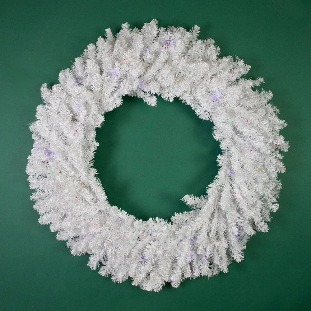 The built-in timer function ensures effortless operation allowing you to set it and forget it as the wreath automatically illuminates for a magical display every evening. Product Features: Pre-lit with 100 multi-color LED lights. Multi-color consists of red yellow green blue purple and pink. Bulb size: concave wide angle. 380 branch tips. 1.25 in. W tapered tips. Additional Product Features: LED lights use 90% less energy. Durable non-glass replaceable bulbs. Cool to the touch. Requires (3) in. AA in. size batteries (not included). Convenient on/off summary and timer located on the battery pack. The timer will run continually: 6 hours on and 18 hours off and repeat until deactivated by pressing the on/off summary. Light sets on the wreath are UL certified and approved for indoor or outdoor use however the wreath itself is recommended for indoor use. If one bulb burns out the rest will stay lit. No assembly required – wreath comes in 1 piece. Includes a heavy duty ring metal frame backing for hanging. Cannot be connected with other lighted items. Dimensions: 36 in. diameter (measured from outermost tip/edge to outermost tip/edge across the wreath). Inner ring dimensions: 19.5 in. – 25 in. Dia. Material (s): PVC/metal/plastic bulbs/wire. Note: Branches are compressed for shipment and need to be fluffed out upon arrival to look like the photo.
