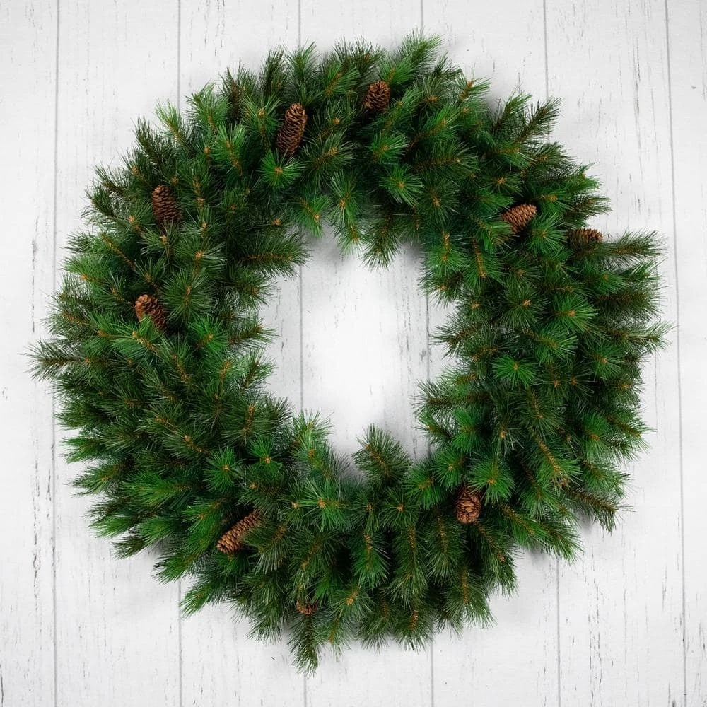 Our beautiful Royal Oregon Pine is always a favorite for its wide branches with long and slender dark green needles. It is perfectly complimented by brown stems giving the wreath a full lush look that requires minimal fluffing. The sturdy branches make it ideal for displaying ornaments and the pine cones give it added realism. Product Features: Unlit 230 tips 3 in. W branch tips For indoor use only – if using outdoors place under a covered area No assembly required wreath comes in 1-piece Includes a heavy-duty ring metal frame backing for hanging Dimensions: 36 in. Dia (measured from outermost tip to outermost tip across the wreath) Material(s): PVC/metal/pine cones.