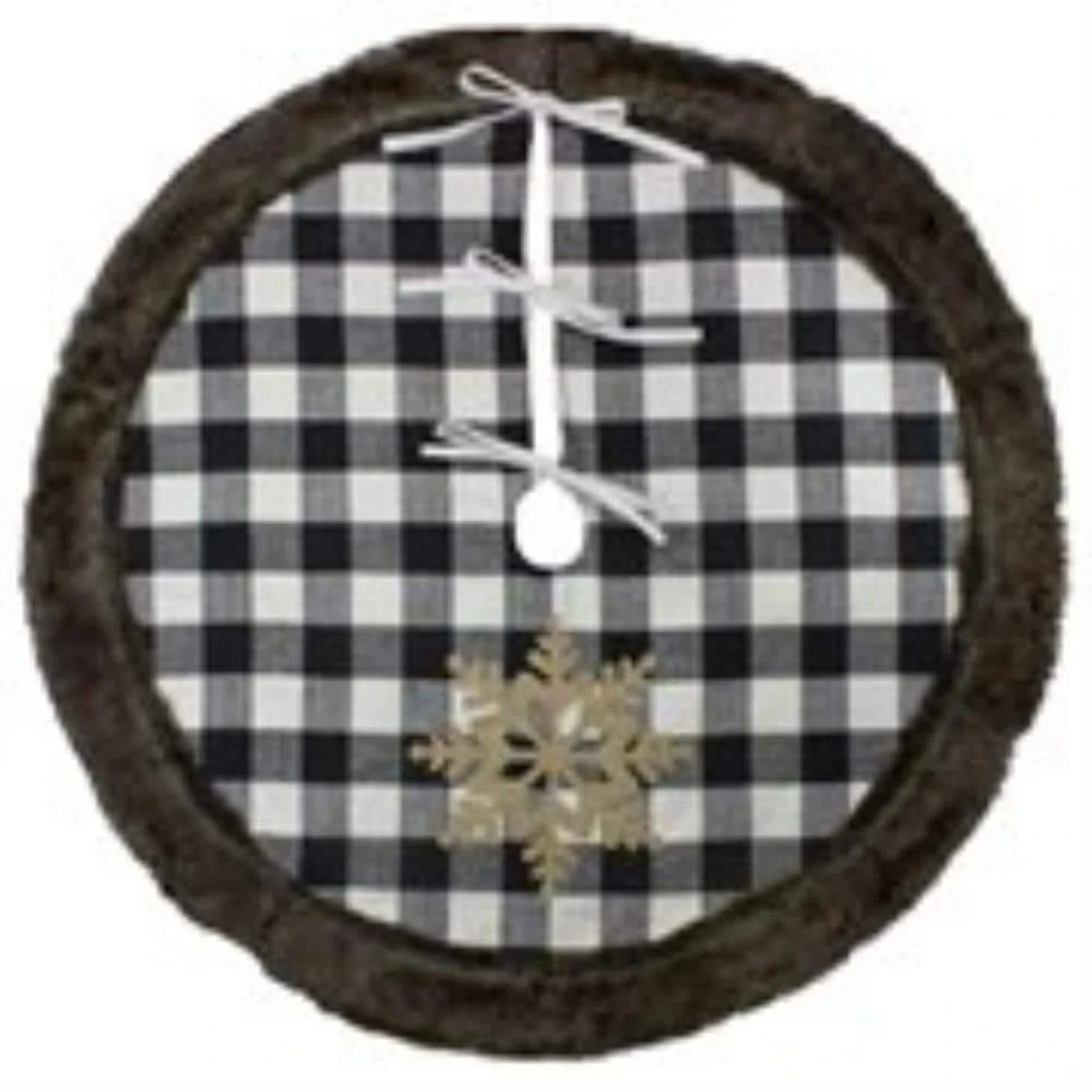 Add a cozy cottage touch to your holiday decor with this plaid tree skirt. The brown fur trim and burlap snowflake will make your tree standout. A perfect addition to your home this Christmas. Product Features: Off-white and black tree skirt. Features a plaid design. Accented with a burlap snowflake. There is brown faux fur border trim. Solid ivory on the back of the tree skirts. Tie closure in the back for placement. 1-sided design. Recommended for indoor use only. Perfect to protect floors and carpets surrounding your tree. Spot clean or dry clean only. Dimensions: 48 in. diameter. Materials: polyester/faux fur/burlap.