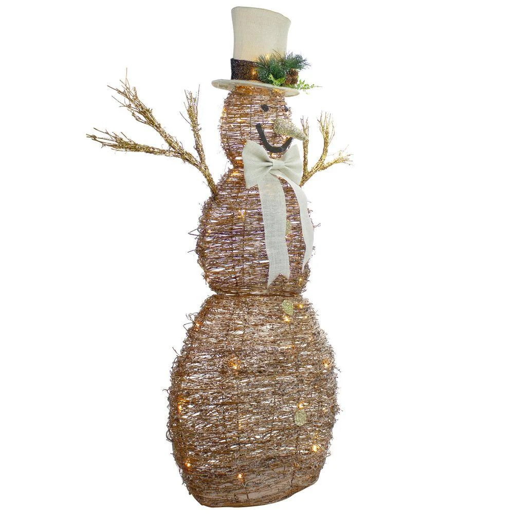 It’s the most wonderful time of the year Bring a frosty friend to your holiday display with this rustic snowman. This rattan snowman is wearing a burlap tophat with pine sprigs and pine cones. He has a matching burlap bow and golden arms with a matching gold nose. This snowman is pre-lit by warm white LED lights and creates a unique glow to your decor. The smiling face of the snowman will create a warm and inviting touch to any area you display it for years to come. Product Features: Rustic rattan snowman yard decorations. Pre-lit by 50 lights. Bulb color: warm white. Bulb size: wide angle. Bulb type: LED. Fully dimensional design. Easy assembly is required. Snowman has a burlap top hat with pine sprigs and pine cones and matching burlap bow. Gold colored arms and nose add a bit of glam. If one bulb burns out the rest will stay lit. UL approved and certified for indoor or outdoor use. Comes with replacement bulbs and spare fuses. Lead cord length on snowmen: 48 in. UL outdoor transformer. Dimensions: 48 in. H x 36 in. W x 8 in. D. Material(s): rattan/metal/glass.