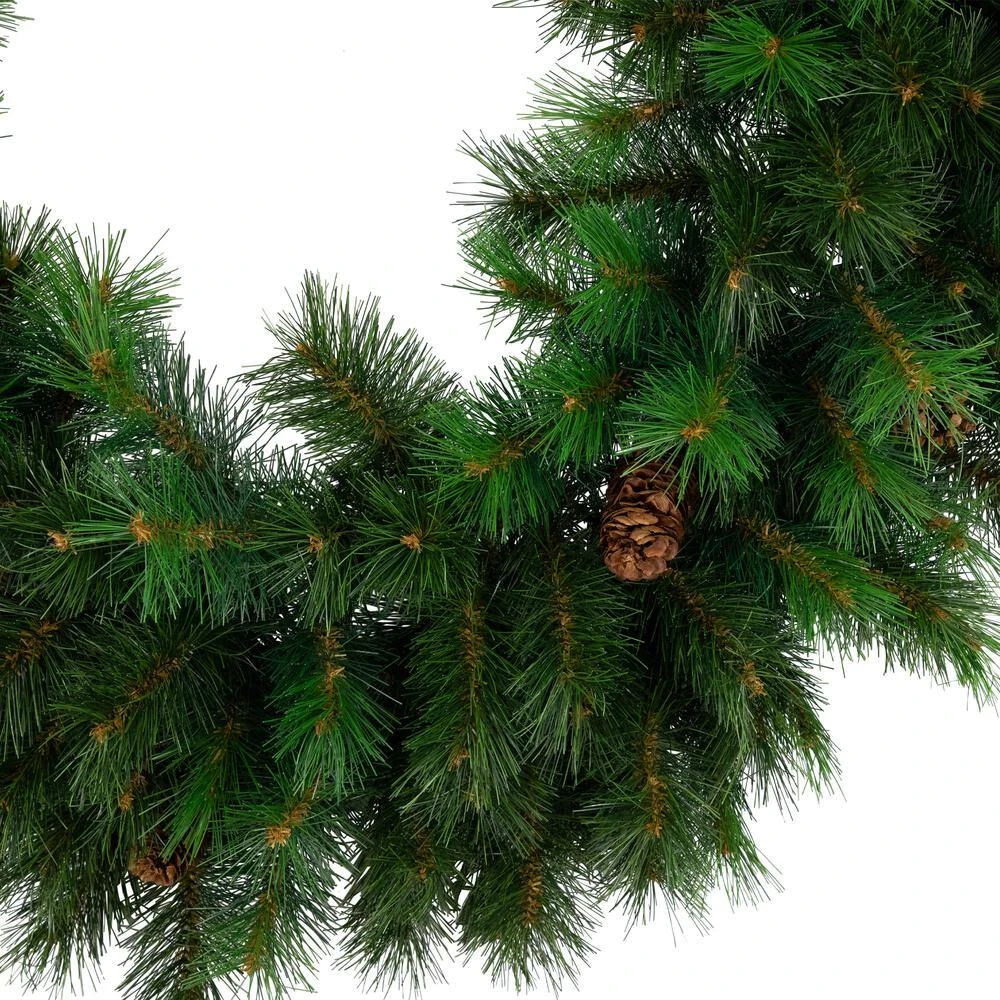 Our beautiful Royal Oregon Pine is always a favorite for its wide branches with long and slender dark green needles. It is perfectly complimented by brown stems giving the wreath a full lush look that requires minimal fluffing. The sturdy branches make it ideal for displaying ornaments and the pine cones give it added realism. Product Features: Unlit 340 tips 3 in. W branch tips For indoor use only – if using outdoors place under a covered area No assembly required wreath comes in 1-piece Includes a heavy-duty ring metal frame backing for hanging Dimensions: 48 in. Dia (measured from outermost tip to outermost tip across the wreath) Material(s): PVC/metal/pine cones.