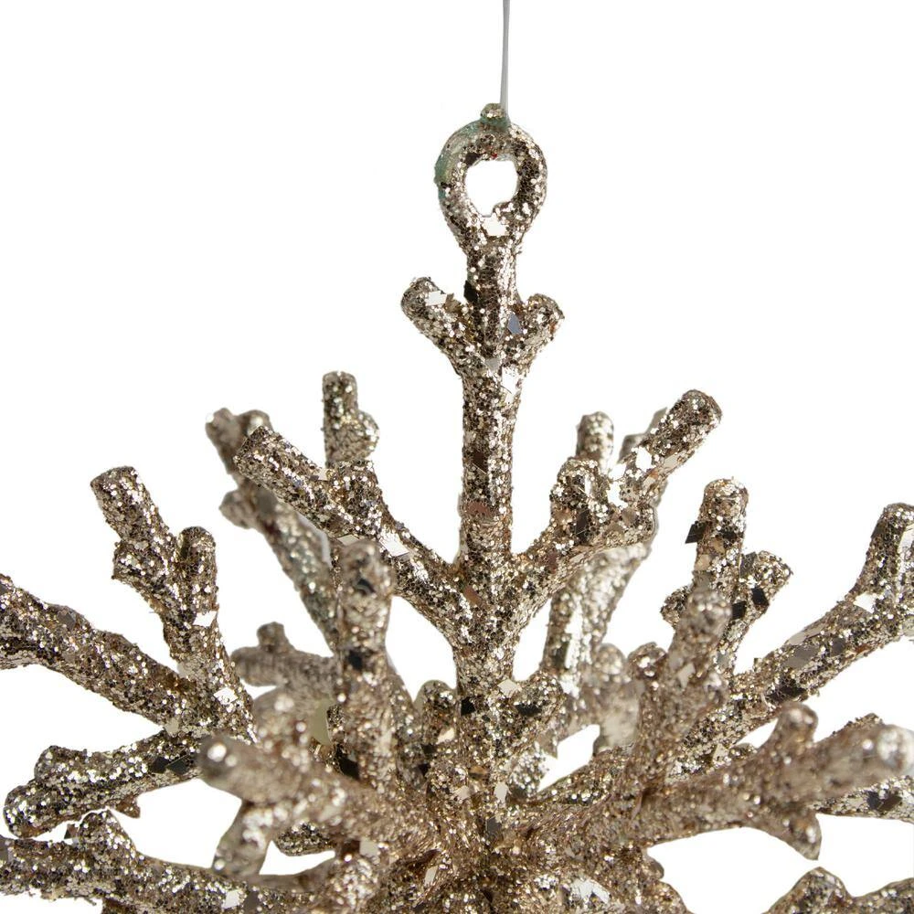 From the Peach on Earth collection this beautiful gold snowflake ornament is a perfect addition to your holiday decor this season. The fully glittered ornament will reflect your lights for extra shine Ideal to match any already existing Christmas decor. Product Features: Snowflake Christmas ornament. Gold snowflake. Fully dimensional ornament. Drenched in gold glitter. Comes ready-to-hang on a gold cord. Dimensions: 7 in. H x 7 in. W x 7 in. D. Material(s): plastic.