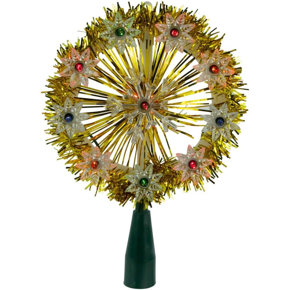 Add a modern touch to the crown of your Christmas tree with this unique topper. It features a silver tinsel wreath with flower lights, and a snowflake center with a silver tinsel starburst. The multi-colored lights consist of red, green, blue, orange and pink.