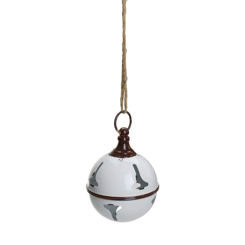 Ring in the cheer this holiday season with this giant jingle bell hanging ornament. The white finish is a classic Christmas color and adds a great pop of color to your Christmas decor. Hang this giant jingle bell anywhere that you want to show your Christmas spirit and bring in some joy. Features: White jingle bell hanging Christmas decoration. Hangs on a jute cord. Hang this on your door or on a large tree. For indoor or outdoor use. JUte cord attached to the brown top. Black marks give it a weathered look. Dimensions: 7 in. H x 5 in. Dia. Material(s): metal/jute.