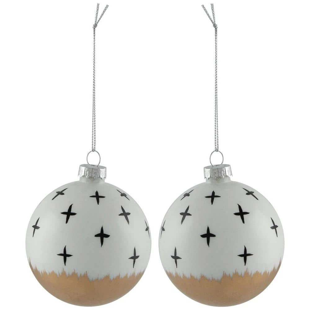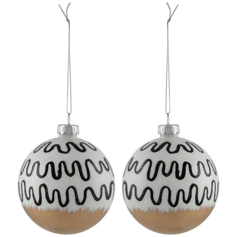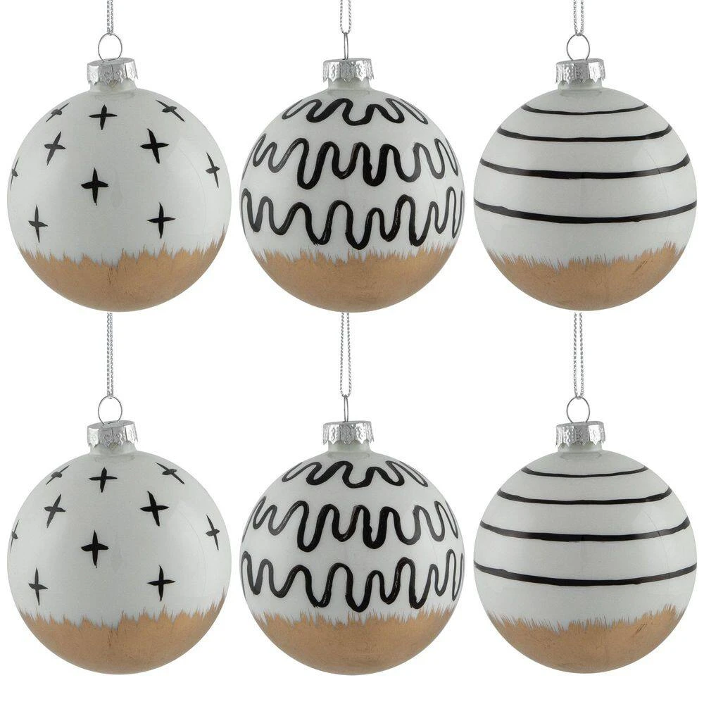 Dive into the enchanting world of holiday elegance with our set of glass ball Christmas ornaments. Crafted with attention to detail each ornament boasts a timeless blend of classic sophistication and modern flair. Adorn your tree with the captivating abstract designs including sleek stripes and mesmerizing wavy lines. Elevate your holiday decor with these stunning ornaments adding a touch of refinement and charm to your seasonal celebrations. Product Features: 6-piece set. Color: White brass and black. Balls are equipped with silver ornament caps. Come ready-to-hang on silver cords. Dimensions: 3 in. (80 mm). Material(s): glass/metal. Note: Set includes 2 of each item shown; total of 6 ornaments.
