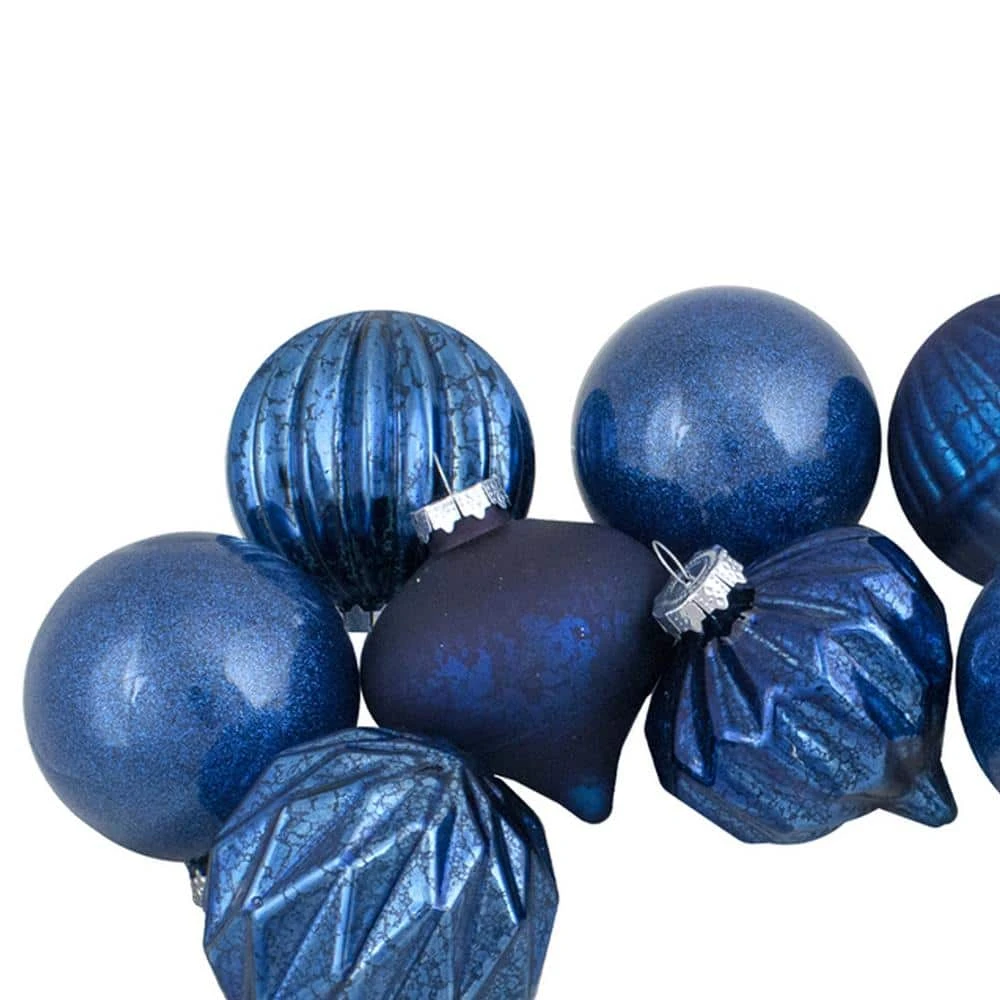 Add a touch of vintage flair to your holiday decor this Christmas season with this set of blue glass ornaments, Shades of blue are perfect to hang on your tree on wreaths or around your home. Created with various finishes and patterns this beautiful set is ready to compliment your home and Christmas decor with ease, Product Features: 12-piece set. Colors: blue. Finish: shiny matte glitter ribbed and faceted mercury glass. Hanging ball and onion finial ornaments. Ornaments are equipped with silver ornament caps (ornament hooks are not included). Dimensions: Balls: 3 in. diameter. Finials: 3.25 in. high x 3 in. diameter. Material(s): glass.