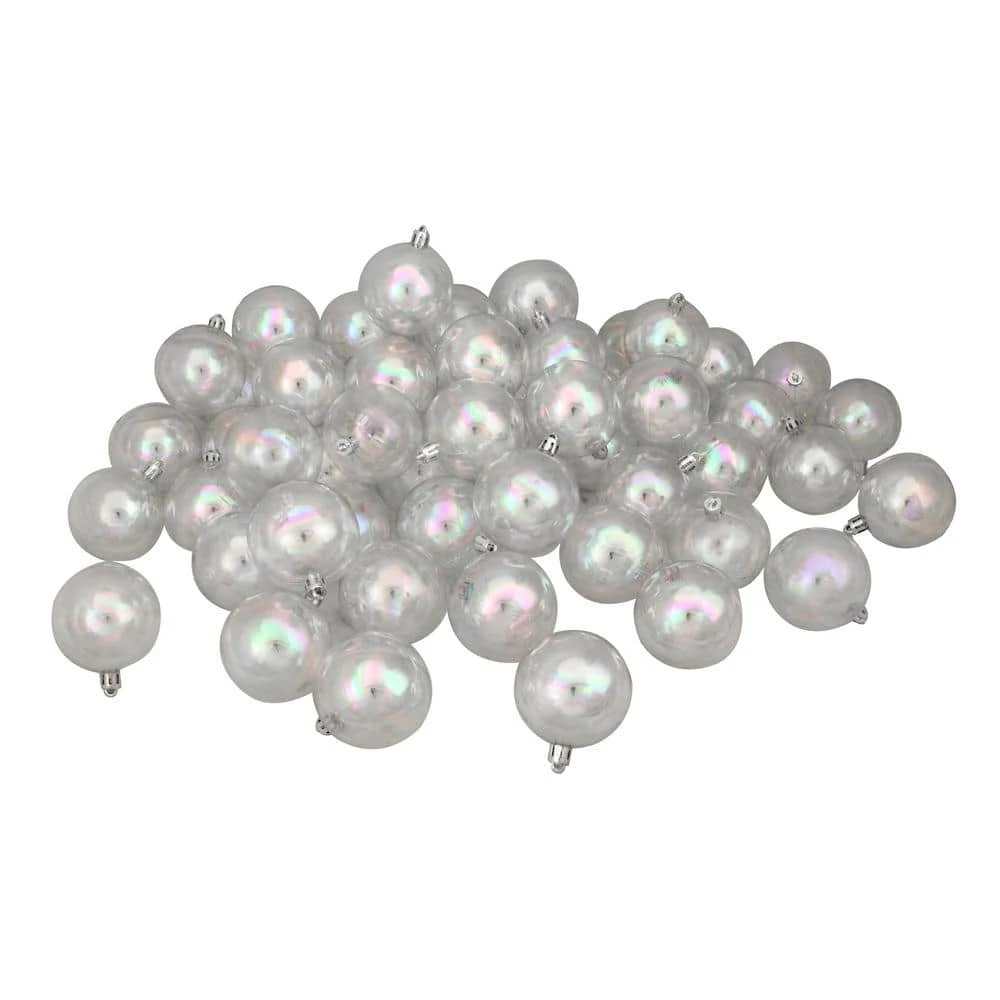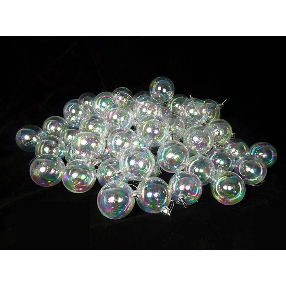60-count Clear Iridescent Shatterproof Christmas Ball Ornaments 2.5 in. (60 mm). This special club pack will allow you to build your collection quickly and decorate with more possibilities. Shatterproof ornaments combine the beauty and luster of real glass with the unbreakable practicality of plastic. Balls are equipped with silver ornament caps covering a tiny pin hole size opening. Pack of matching silver string hangers are included for optional use (ornament hooks not included). Dimensions: 2.5 in. Dia (60 mm). Material(s): plastic.