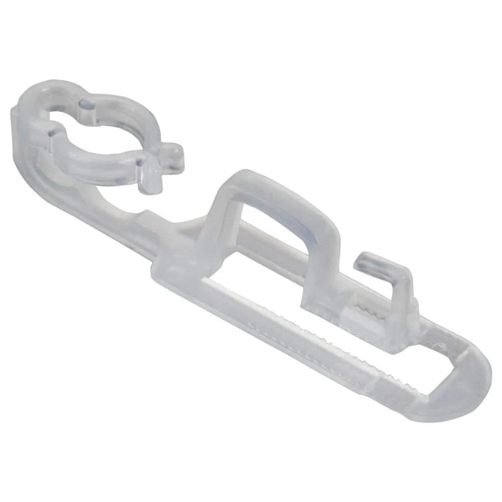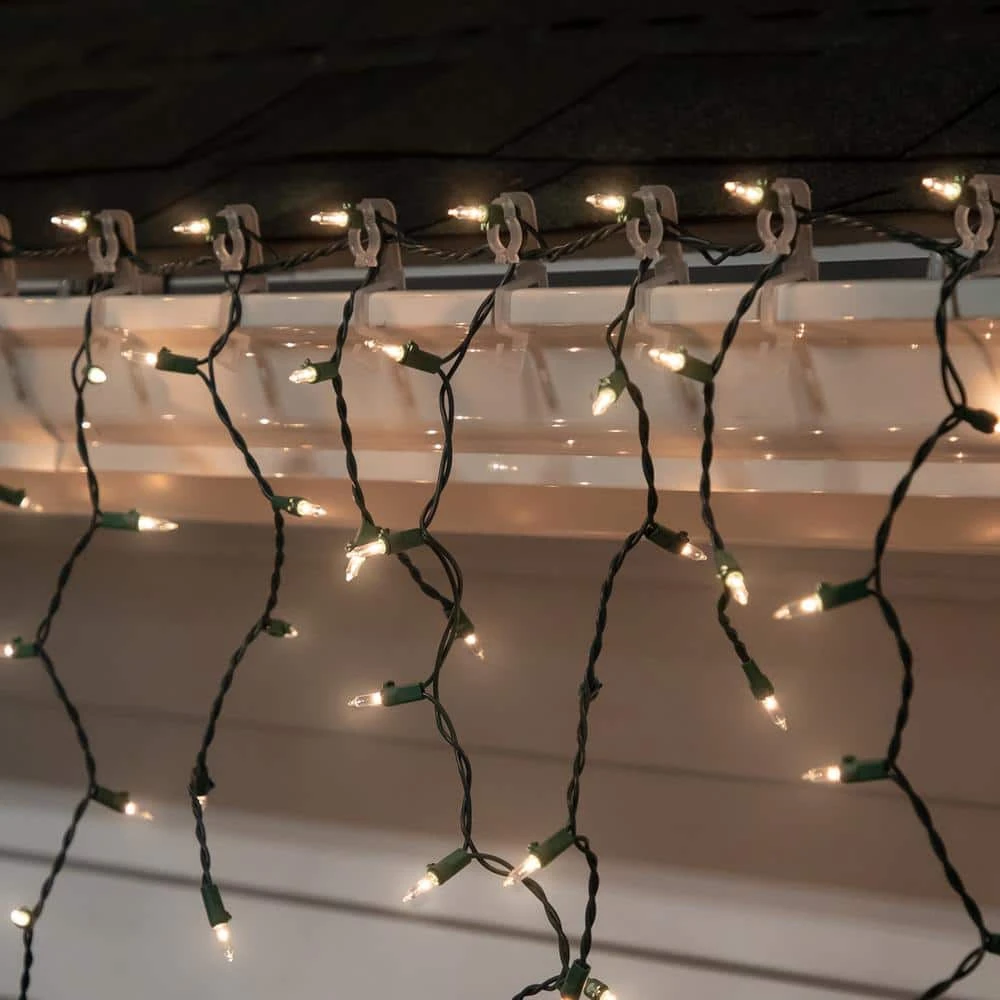Make decorating a breeze instead of a chore while leaving time for you to enjoy all the holiday fun. Discreetly hang your holiday decor with these clear gutter and shingle clips. Light strings can attach to the clip through wire guides to securely hold lights without forcing or twisting. Features: Plastic gutter and shingle clip. Works with most C7 C9 mini icicle curtain and LED light sets. Can also be used for garland or other decorations. Snaps on gutters or slides under shingles. Recommended for indoor or outdoor use. Made of weatherproof and reusable material. Not intended for permanent installation; For seasonal use only. Hooks are designed to fit all standard gutters and shingles and work on most roofs. Dimensions: 3.5 in. H x 0.75 in. W x 1 in. D. Material(s): plastic. Note: Set includes 26 clips.