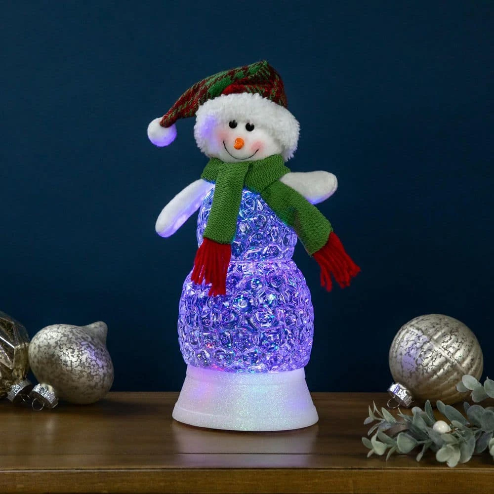 Add a touch of festive charm to your holiday decor with this delightful snowman snow globe. This battery-operated decoration features a sparkling crystal-like design that acts as a prism for the multi-color lights creating a magical atmosphere. Perfect for any tabletop or mantel this adorable snowman will bring joy and cheer to your home this Christmas season. Product Features: LED Lighted snowman snow globe. Pre-lit with multi-color LED lights. Showcases a crystal like design. Requires 3 AA batteries – not included. On/off switch located on the bottom. For indoor use only. Dimensions: 11 in. high x 4 in. diameter. Material(s): acrylic/fabric.