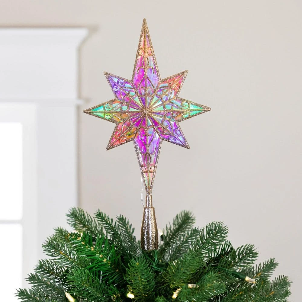 Bring a touch of charm to your holiday decor with our lighted star Christmas tree topper. Crafted in the classic Star of Bethlehem design it features champagne gold glittered swirl accents that sparkle beautifully under the glow of LED multicolor lights. Perfect for adding a festive and enchanting flair to your Christmas tree this season. Product Features: 3D 8-point star Christmas tree topper. Lighted with 10 LED multicolor lights. Iridescent star with champagne gold glittered design. Double-sided design. Circular cone base. Requires 2 in. AA