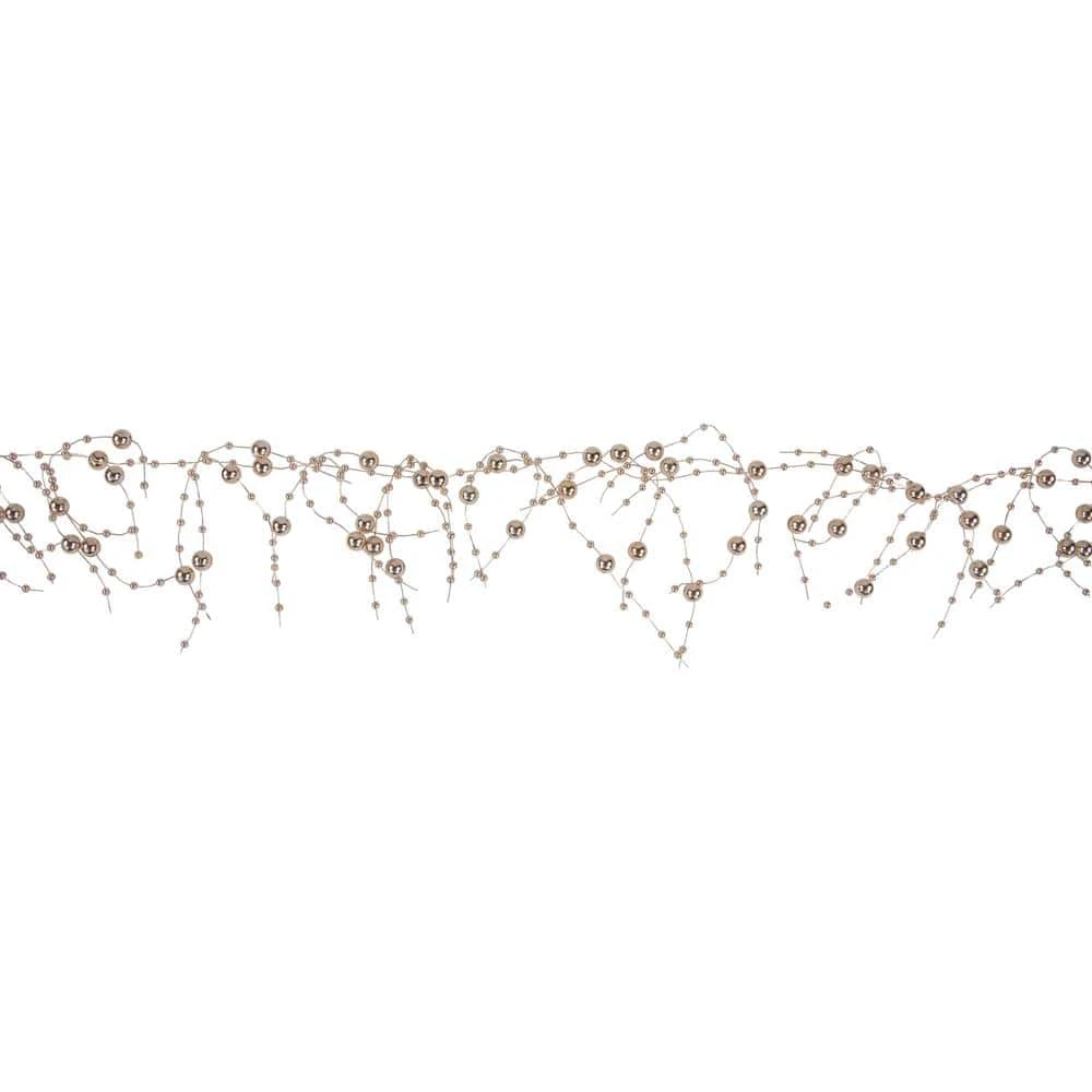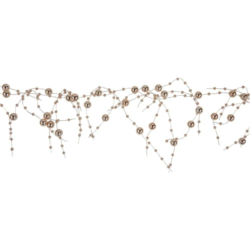 This beautiful metallic rose gold beaded garland will add a touch of elegance to your holiday decor. Featuring different sized rose gold beads in a stunning metallic finish this garland will sparkle and shine creating a festive ambiance in any room. Perfect for draping over your Christmas tree along your mantle or hanging from your staircase this garland will become a cherished part of your holiday traditions for years to come. And since it’s unlit you can add your own string lights to create a warm and inviting glow. Don’t settle for ordinary holiday decor elevate your style with this exquisite rose gold garland. Features: Unlit. Crafted with different sized rose gold beads in a metallic finish. Includes plastic wire loops on each end for easy hanging. Recommended for indoor use. Dimensions: 5 ft. long x 2 in. W . Material(s): plastic.