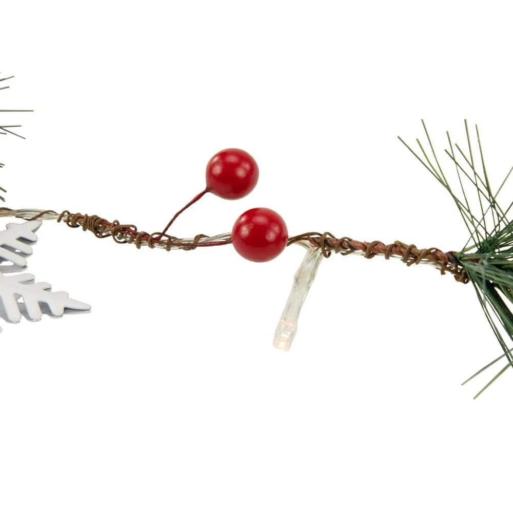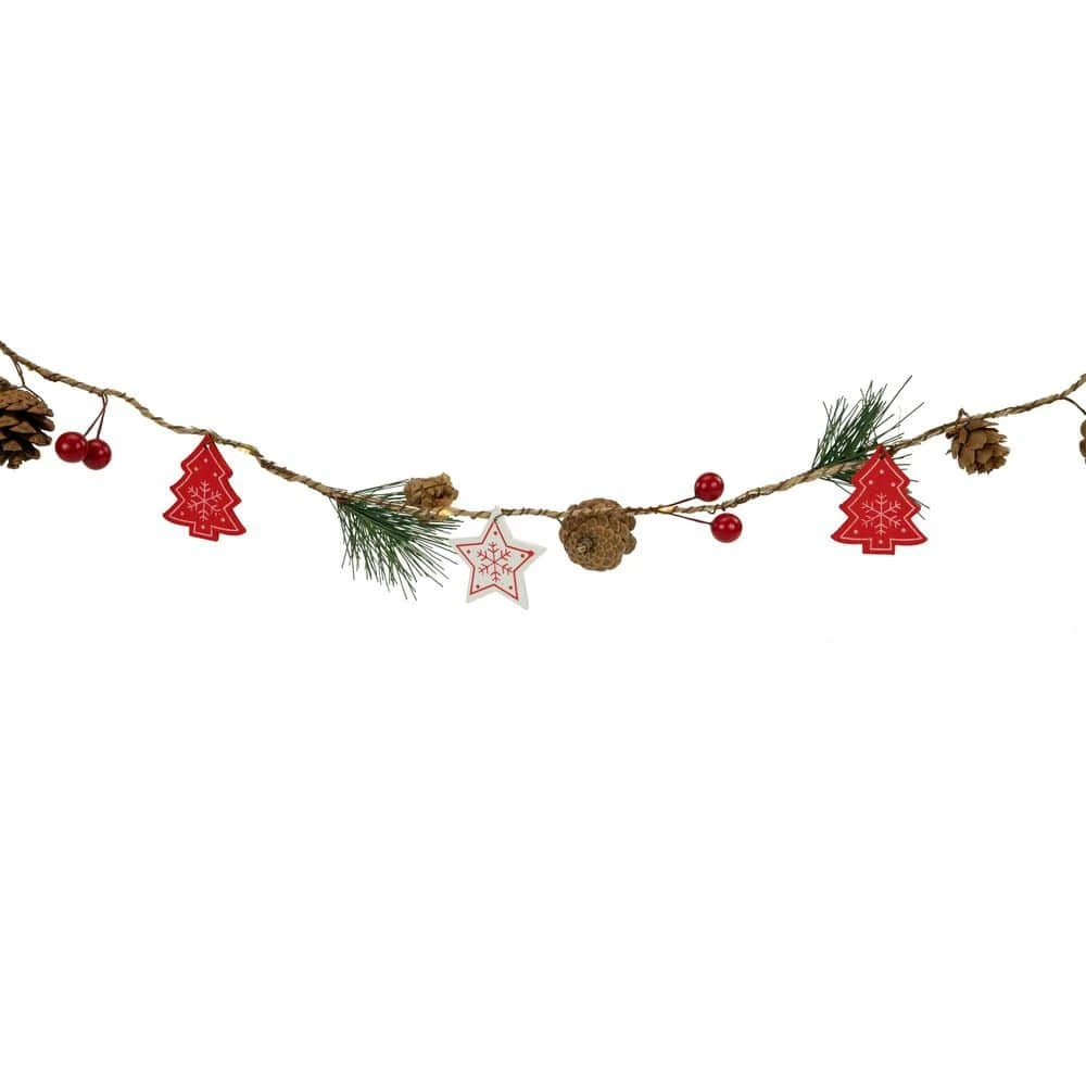 This battery-operated pine berry and pinecone garland will add a touch of nature to your home. Also decorated with red Christmas trees and white stars it adds a pop of color and will make your Christmas decorating a breeze. Battery-operated means you can place them anywhere. Durable and highly flexible these lights can be displayed quickly and easily for all of your holiday decorating needs. Product Features: Color: warm white bulbs / clear wire. Holly berries pine sprigs trees and stars. Number of bulbs on string: 20. Bulb type: incandescent. Bulb size: micro fairy. Spacing between each bulb: 4 in. Lighted length: 5.25 ft. 11.75 lead cord. Additional Product Features: Non-replaceable bulbs. Requires 2 ‘AA’ batteries – not included. Convenient on/off switch on battery pack. Comes ready to hang from jute loops on each end. Covered outdoor area or indoor use recommended. Dimensions: 7 ft. long x 2 in. wide. Material(s): PVC/plastic/foam/wire/wood/jute.