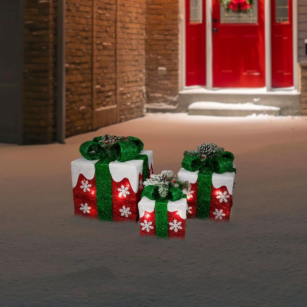Get into the holiday spirit with this gift box set. This set features elegant-looking pre-lit gift boxes are red with white snowflakes and snow capped tops. They are accented with pine cones berries and green bows. These will be the perfect addition to your porch entryway tabletop or anywhere you wish to add a little holiday charm. Product Features: Christmas gift boxes decoration. Pre-lit with 40 clear lights. Bulb size: mini. Bulb type: incandescent. If one bulb burns out the rest will stay lit. Contains 1 plug with an end connector which allows you to stack multiple lighted items together (210-watt max). Comes with replacement bulbs and spare fuses. Some assembly required; ground stakes not included. UL approved and certified for indoor or outdoor use. Recommended for outdoor use. Lights per box: Small: 10 lights. Medium: 10 lights. Large: 20 lights. Dimensions: Small: 6