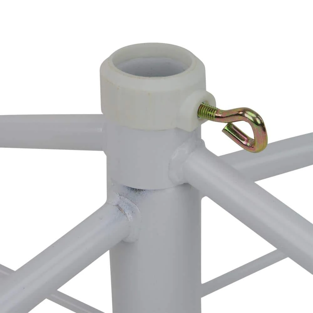 Show off your tree with style and ease using this sturdy artificial Christmas tree stand. This white metal stand is not only sturdy enough to hold your tree and your favorite ornaments but features wheels so you can position it and re-position it whenever you choose. Once you pick your favorite position the handy caster wheels lock into place to ensure that your tree stays stable during the holidays. Features: White rolling Christmas tree stand. Folds down for easy storage. Features plastic caster wheels for easy positioning. Caster wheels lock into place for stability. Bolt on base to adjust pole diameter and lock tree into place. Color: white. Stand can accommodate a 6.5 ft. to 7.5 ft. artificial tree. Recommended for indoor use only. Dimensions: Pole diameter: 1.25 in. Stand fully assembled: 10 in. H x 22 in. W x 22 in. L. Stand folded: 10 in. H x 22 in. W x 4 in. W. Material(s): metal/plastic.