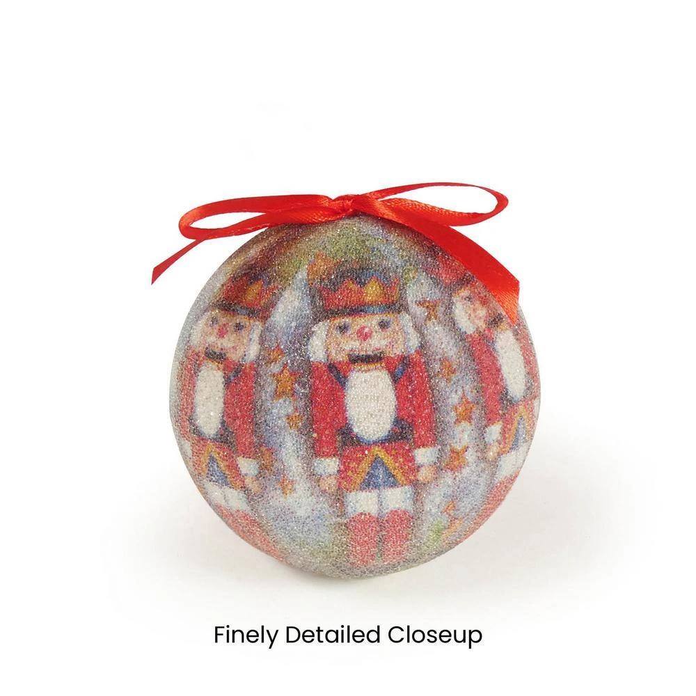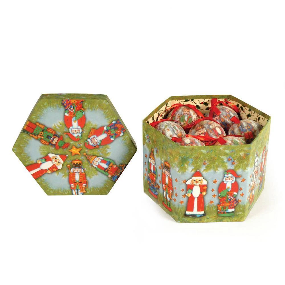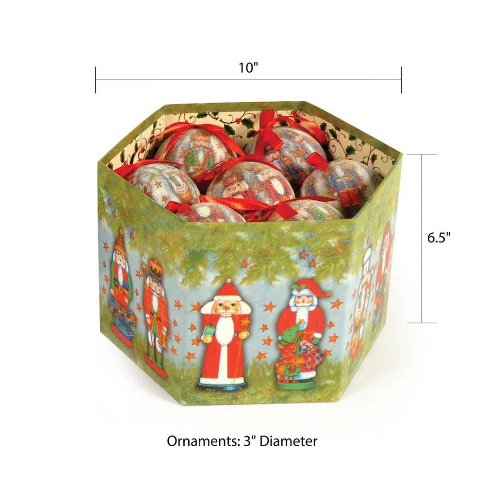 Decorate your home or office with a set of traditional nutcracker hanging ornaments. These adorable characters are finished off with ribbon ties for easy hanging. Featuring different illustrated nutcrackers, these decoupage ornaments will light up any family tree. Each set of 14 includes a designer gift box that doubles as storage for safe keeping. Celebrate many family memories with these affordable, quality baubles. Each individual ornaments is 3 in. Dia x 3-1/2 in. H.