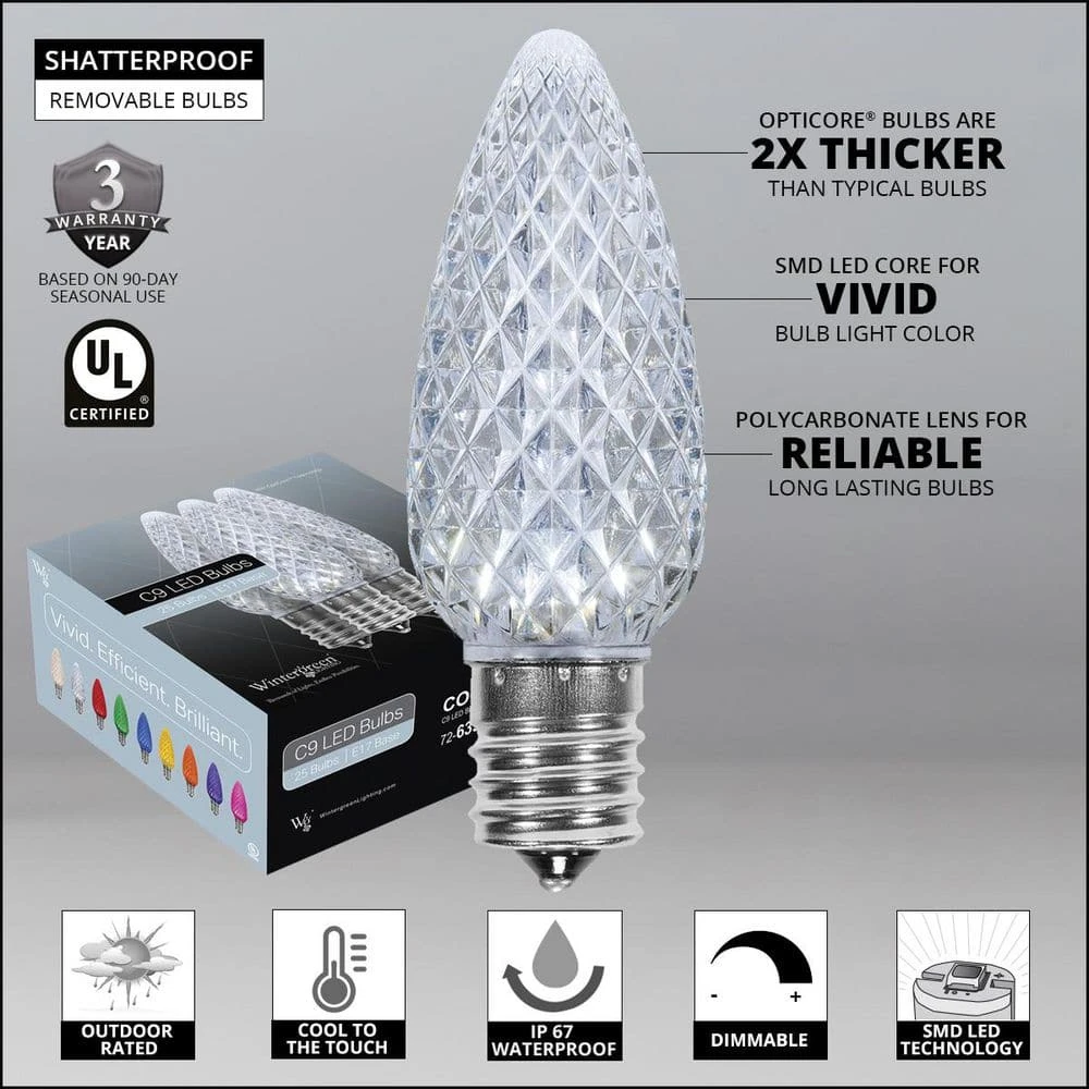 - 25 OptiCore C9 cool white LED bulbs and one 25 ft. green E17 stringer with sockets spaced 12 in. apart, 6 in. leads with fused polarized male plugs, 6 in. tails with female plugs for end to end connections, 25 ft. total light kit length, to assemble, simply twist bulbs into sockets