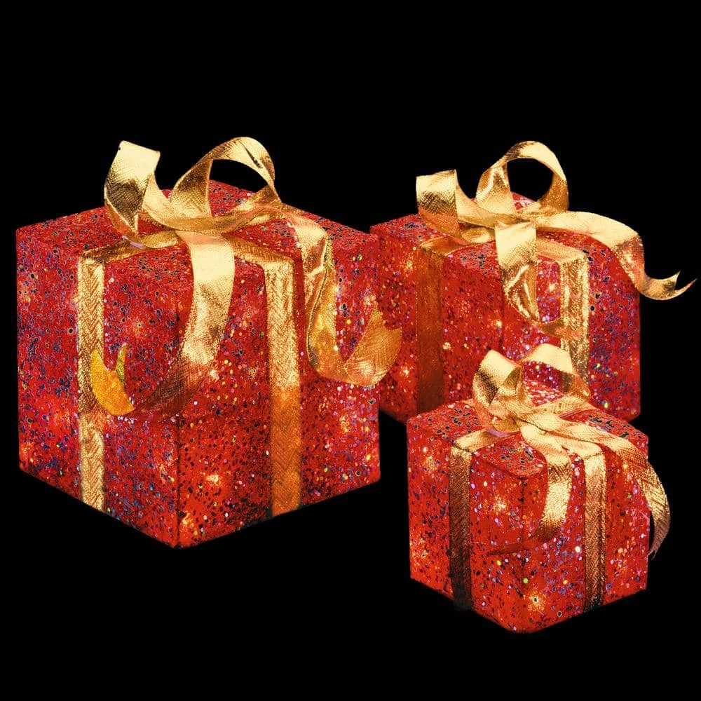 This attractive pre-lit Gift Box Assortment includes three red sisal boxes wrapped with gold bows. Box sizes are 10 in., 8 in. and 6 in. and contain respectively 35, 20 and 20 clear lights. The glittered sisal material is strong and durable to provide many years of enjoyment and can be displayed in indoor or covered outdoor locations.