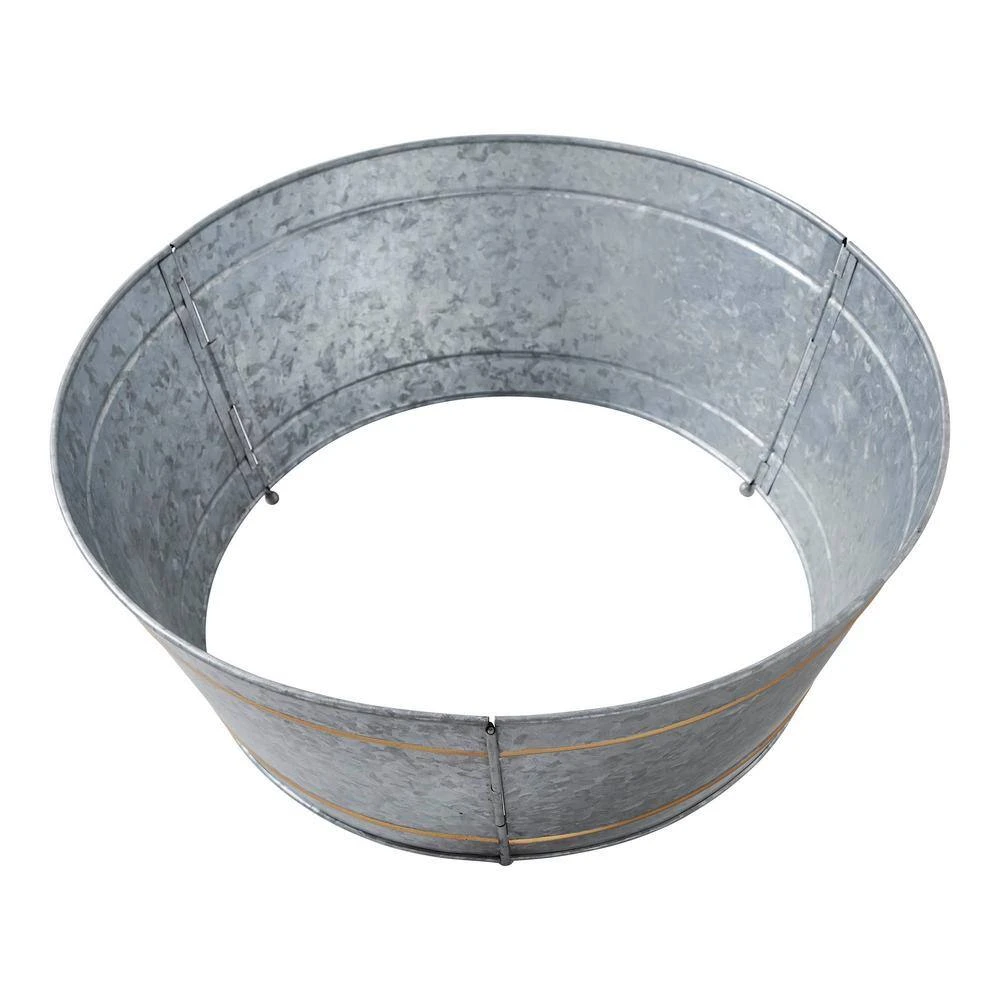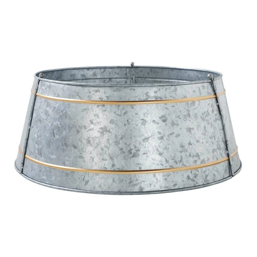 Introducing the VHC Brands Metal Christmas Tree Collar in Metal Grey with brass gold accent bands, a charming addition to your holiday decor that brings rustic elegance to your Christmas tree display. Crafted from sturdy metal and featuring a round design, this decorative tree collar offers a unique twist on traditional tree skirts, providing a stylish and primitive base for your festive centerpiece. Measuring 8 in. x 20 in. x 20 in., it fits most standard-sized trees, adding a touch of rustic charm to your dining room, entryway or living room. With its galvanized finish and primitive design, this metal tree collar complements various decor styles, seamlessly blending with rustic, farmhouse and primitive Christmas themes. Its 2-tone color and hinge pin assembly ensure stability and durability, offering a reliable base for your tree while enhancing the holiday ambiance of your home. Easy to assemble and maintain, simply wipe clean with a soft cloth to keep it looking pristine throughout the holiday season.