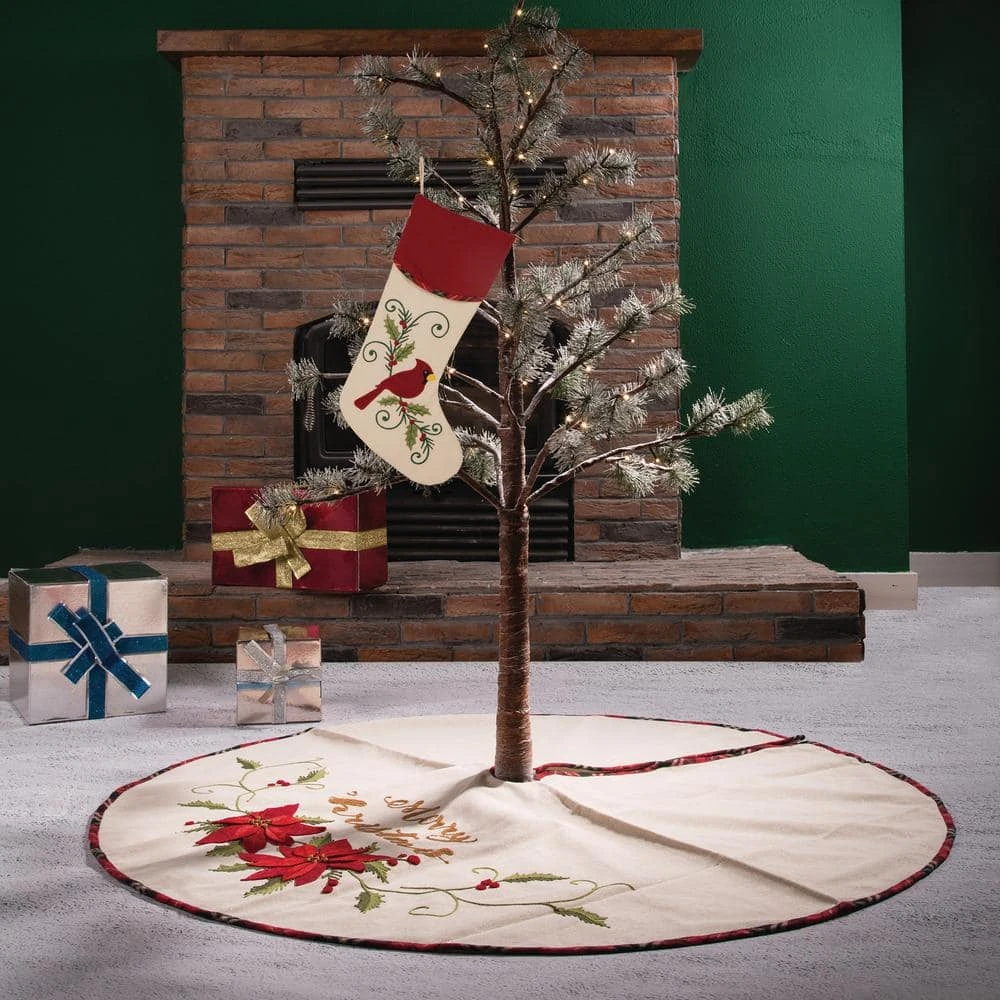 The Christmas tree skirt is designed to be placed around the bottom of your Christmas tree as a stylish protector against tree debris and as a mat for presents. This stylish stocking embellished with bird and branches with a feeling break out the winter to warm spring Set of 2 Featured with traditional cardinal design. Fabric Content: 80% Polyester, 20% Linen Washing instructions: Cold water wash. Do not iron. Machine washable. Use stain/spot remover if needed.