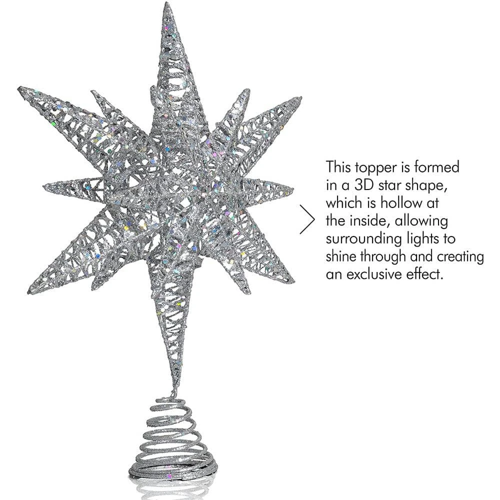 ORNATIVITY Glittered Star Tree Topper is finished in a layer of glitter and istopped with shiny sequins to add to the brightness of the topper. When itsparkles at the top, this Christmas tree topper will elaborate the beauty ofyour designed holiday tree. This topper is formed in a 3D star shape, which ishollow at the inside, allowing surrounding lights to shine through andcreating an exclusive effect. The high-quality lightweight topper will allowfor easy storage and reuse yearly. There is an attached coil holder at thebottom which is super secure and will make attaching the topper so muchsimpler. This Christmas star tree topper can be a perfect gift that yourfamily and friends will greatly appreciate. This will enhance the holidayspirit in your home with an extra glittery twinkle.
