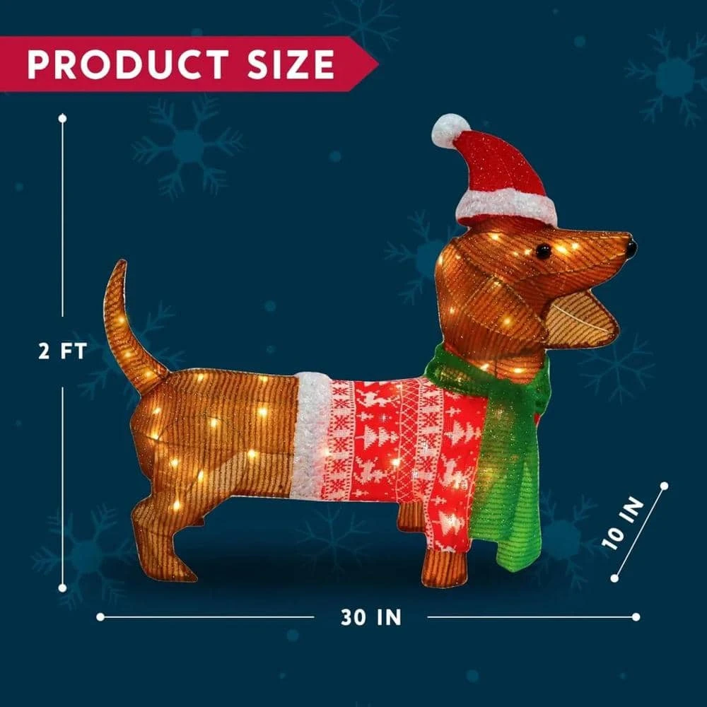 Add more fun to your home during Christmas holiday with this unique and merry decoration! Our Wiener Dog Yard Light includes a 2 ft. Tall Tinsel Wiener Dog with 40 LED Warm White Lights in Clear Wire, Metal Stakes and Zip Ties. Our own unique Wiener Dog with Scarf, Cloth, and Christmas Hat design of Christmas Yard Light is easy to set up.