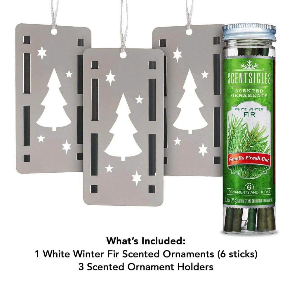 Bring your favorite Christmas scents into your home with these Decorative scented ornament Holders. This set of 3 metal holders allows you to fill each with 2 fragrance-infused Scentsicles sticks and enjoy for up to 30 days. Hang the ornaments on your tree, a window hook, or even the hanger hook in your car! This bundle includes three metal holders and one bottle of the best-selling Scentsicles White Winter Fir scented ornaments, which includes 6 ornament sticks and 6 hooks. This reusable design allows you to enjoy the quintessential scent of fresh-cut Christmas trees and refill next holiday season.